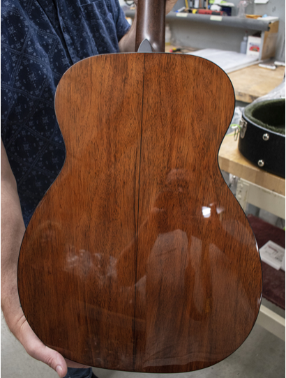De afgelopen jaren speelde ik regelmatig op gitaren met een torrefied bovenblad en was daar standaard van onder de indruk. Door een speciale behandeling wordt het hout ‘gebakken’ in een oven en dat versnelt het verouderdingsproces. Het geeft meer stabiliteit en een wat directere, ‘drogere’ klank die iets wegheeft van een vintage gitaar. Omdat ik graag een kleine alleskunner wilde laten bouwen waar ik op kan strummen én fingerpicken heb ik lang getwijfeld tussen sitka (vriendelijker, warmer, maar ook iets sneller rommelig als je gaat strummen) en Adirondack (power, precisie, veel laag, geschikt voor strummen, maar minder vriendelijk en soms een beetje schel). Het werd torrified sitka. Dat heeft niet het overweldigende van adirondack, maar voor mij klinkt torrefied sitka ook gewoon precies goed. Gecombineerd met mahonie, maar dan met iets extra’s. Iets dat dat méér is dan precies goed, alleen al vanwege het verhaal erachter: Sinker Mahogany.Dat zijn oude bomen die decennia lang op de bodem van de rivier hebben gelegen en nu weer zijn opgevist. Door deze langzame veroudering onder extreme omstandigheden klinkt het nét even anders en wat rijker dan ‘gewoon’ mahonie.