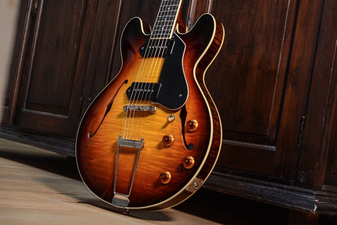 De sunburst begon eeuwen geleden als een ‘German Burst’ bij meubel- en vioolbouwers in Duitsland die het hout soms een wat donkerder randje gaven. Waarom? Gewoon, omdat ze het mooi vonden en dat trucje werd later overgenomen door gitaar en mandoline bouwers. Zo’n instrument met een helder, licht midden en een steeds donkerder wordende kleur naar de randen leek een beetje op een ondergaande of opkomende zon, vandaar de naam: sunburst. Later gebruikte Gibson het soms als een handig trucje om iets minder fraai hout toch te kunnen verwerken in een instrument. Daarom was een J45 mét sunburst ooit 5 dollar goedkoper dan de J50 met een natural bovenblad. Nu is dat andersom: een sunburst kost meer tijd en is daardoor vaak wat duurder.