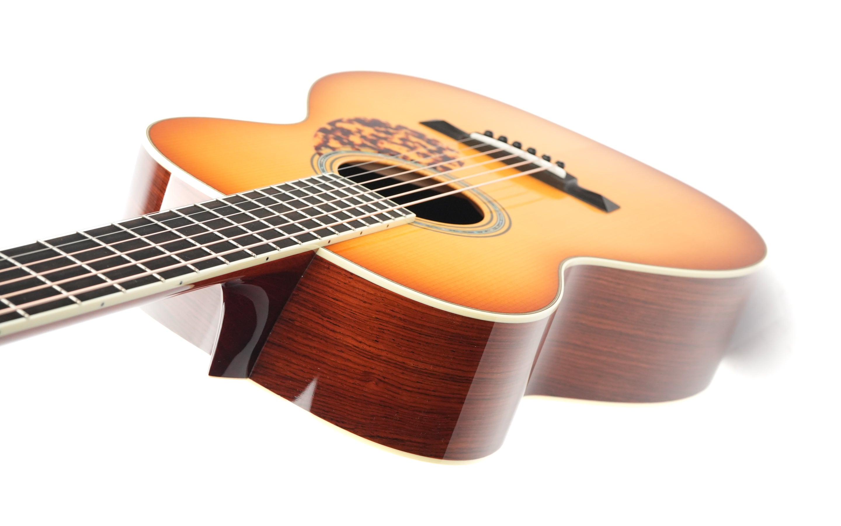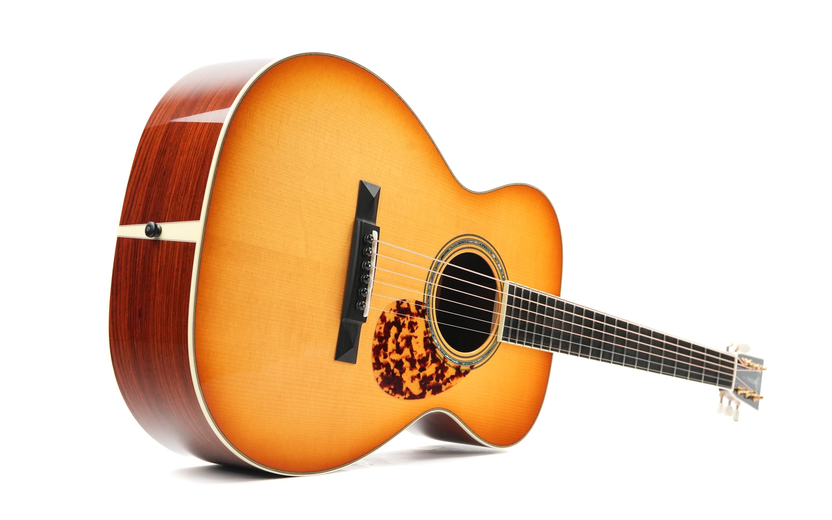 Diese maßgefertigte 03A mit 14 Bünden und Western-Shaded-Finish auf der Adirondack-Fichtendecke besticht durch einen ausgewogenen und vollen Klang mit ausgeprägten Bässen und hoher Lautstärke, dank der gelungenen Holzkombination. Boden und Zargen aus Cocobolo sind für sich genommen schon atemberaubend schön und ergänzen die Decke klanglich und optisch perfekt.