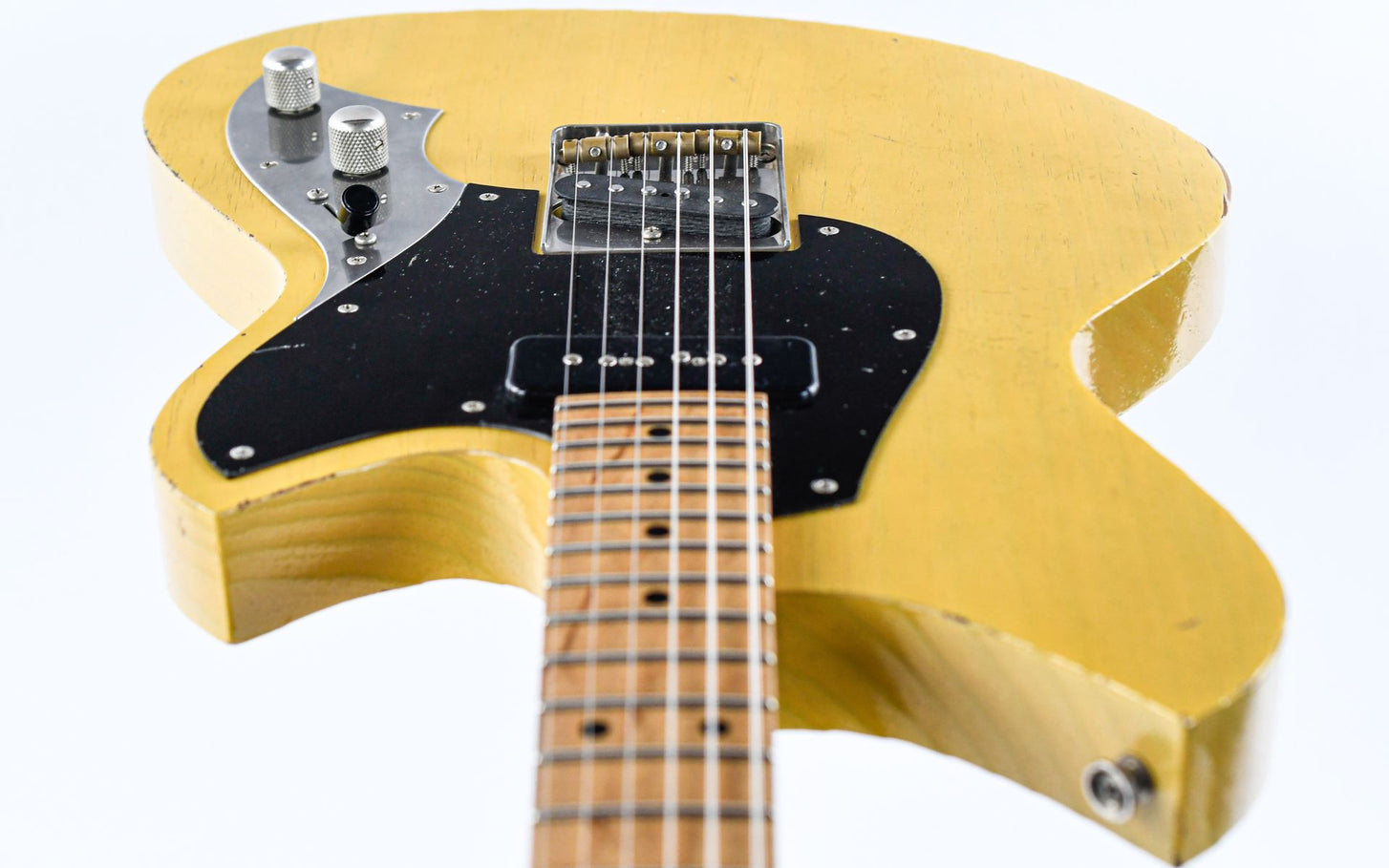 Wir sind sehr glücklich, einer der beiden europäischen Händler von Novo Guitars zu sein, und diese Serus T in Butterscotch Blonde Finish war eine der ersten, die bei uns eintraf!Das Modell Novo Serus T ist sicherlich eine Kraft, mit der man rechnen muss. Ein versetzter Korpus, ausgestattet mit einem Fralin P45 in der Halsposition und einem Fralin Tele in der Brücke. All dies ist von einem Korpus aus gehärtetem Kiefernholz mit einer coolen Butterscotch Blonde-Lackierung umgeben.