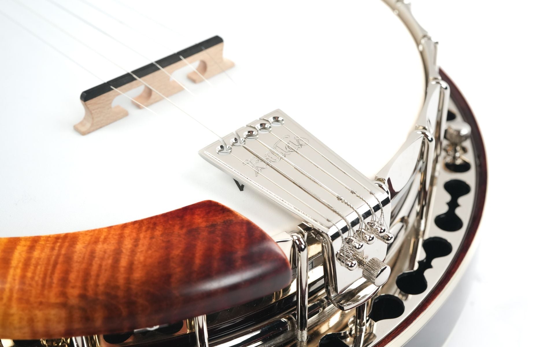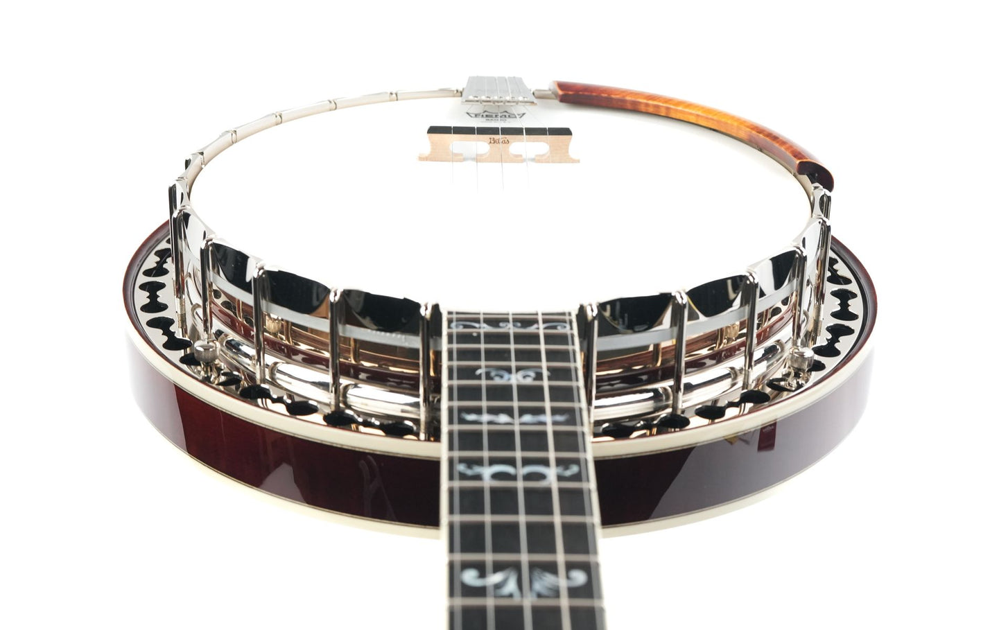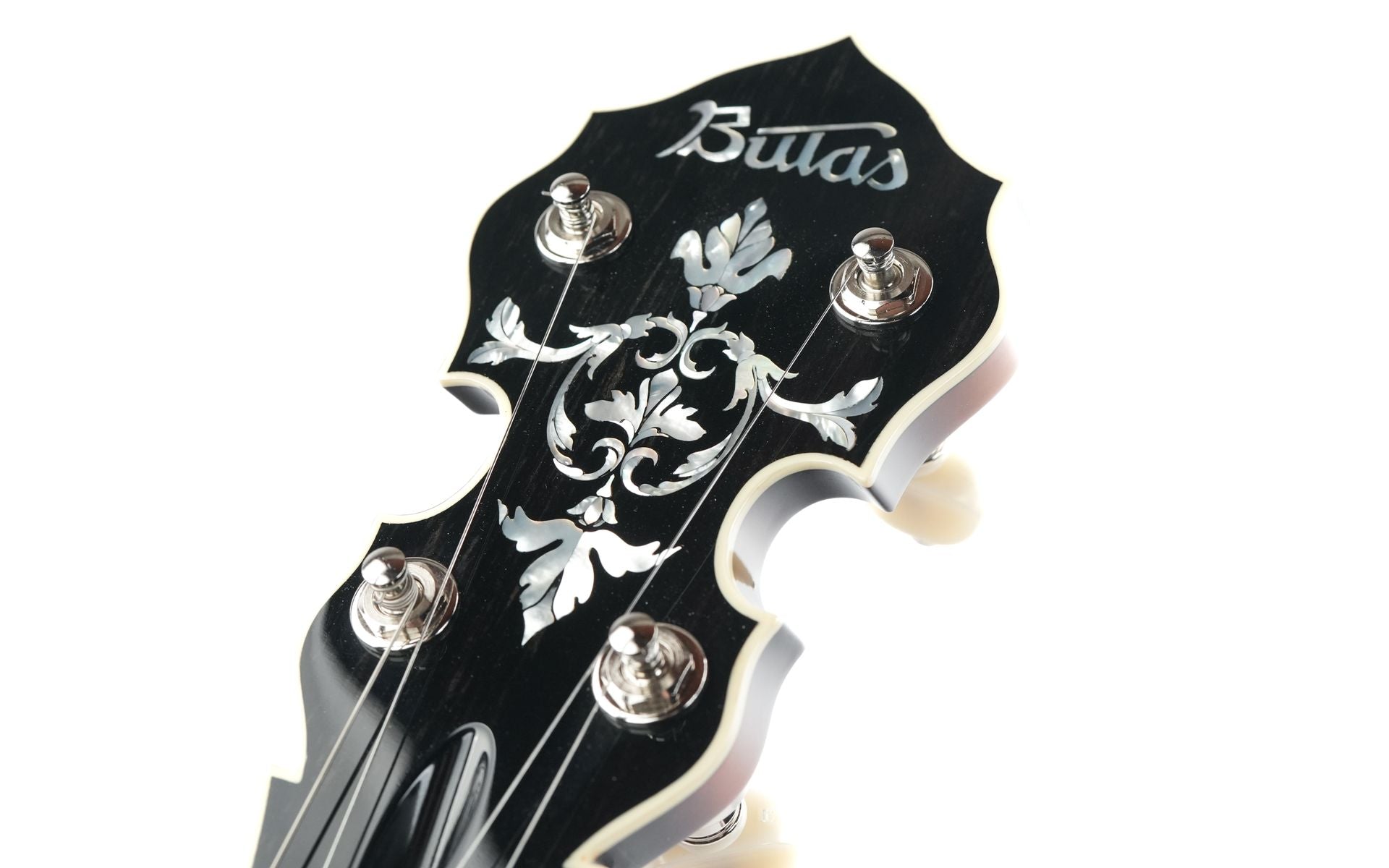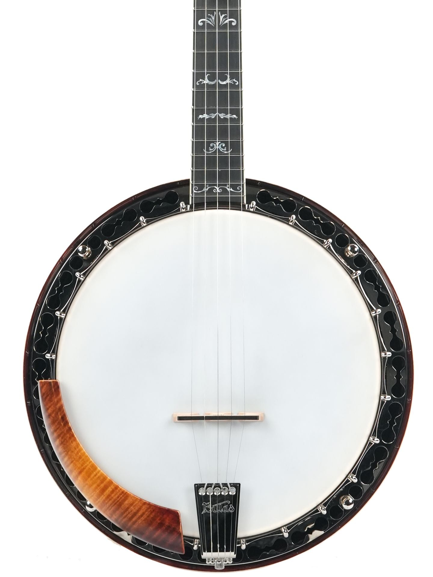 Optisch und ergonomisch ist das Echo Valley ebenso beeindruckend wie klanglich. Die hochwertige Nitrozelluloselackierung in Cremona Sunburst betont die Maserung des Ahorns, während das Ebenholzgriffbrett mit eleganten „Maiglöckchen“-Einlagen und die handgefertigte Armlehne aus Holz für Komfort und Stil sorgen. Gotoh-Mechaniken mit Galaith-Knöpfen, ein Saitenhalter im Kershner-Stil und ein einteiliger Bulas-Flansch vervollständigen dieses professionelle Instrument, das sowohl traditionelle Bluegrass-Rolls als auch moderne Spieltechniken unterstützt.