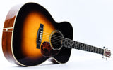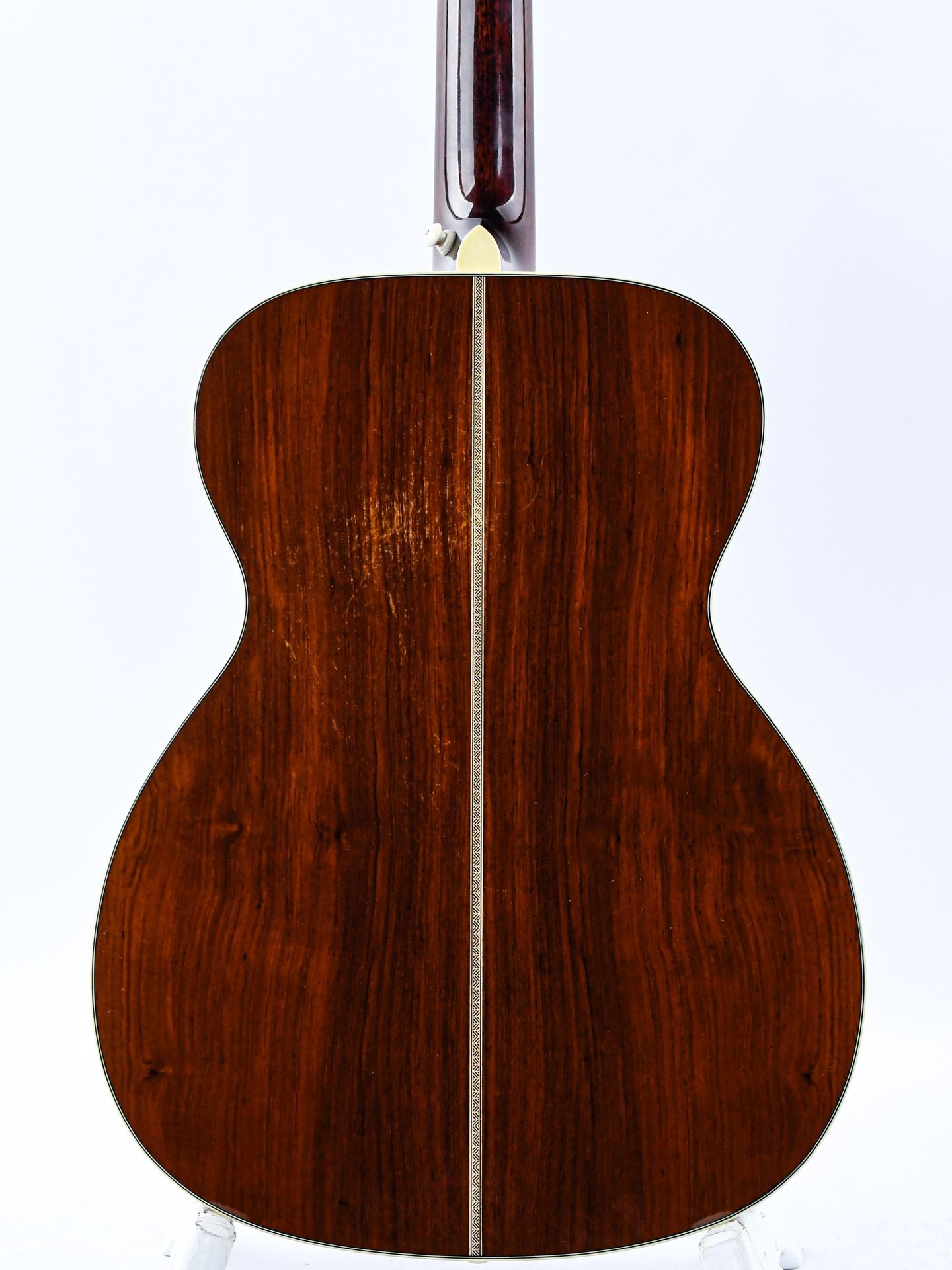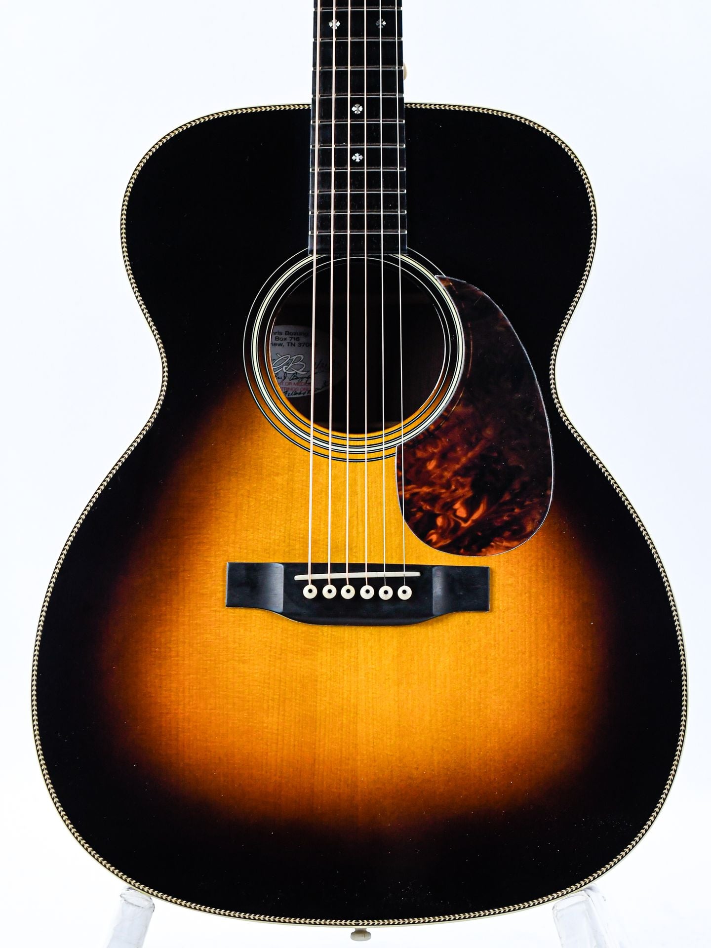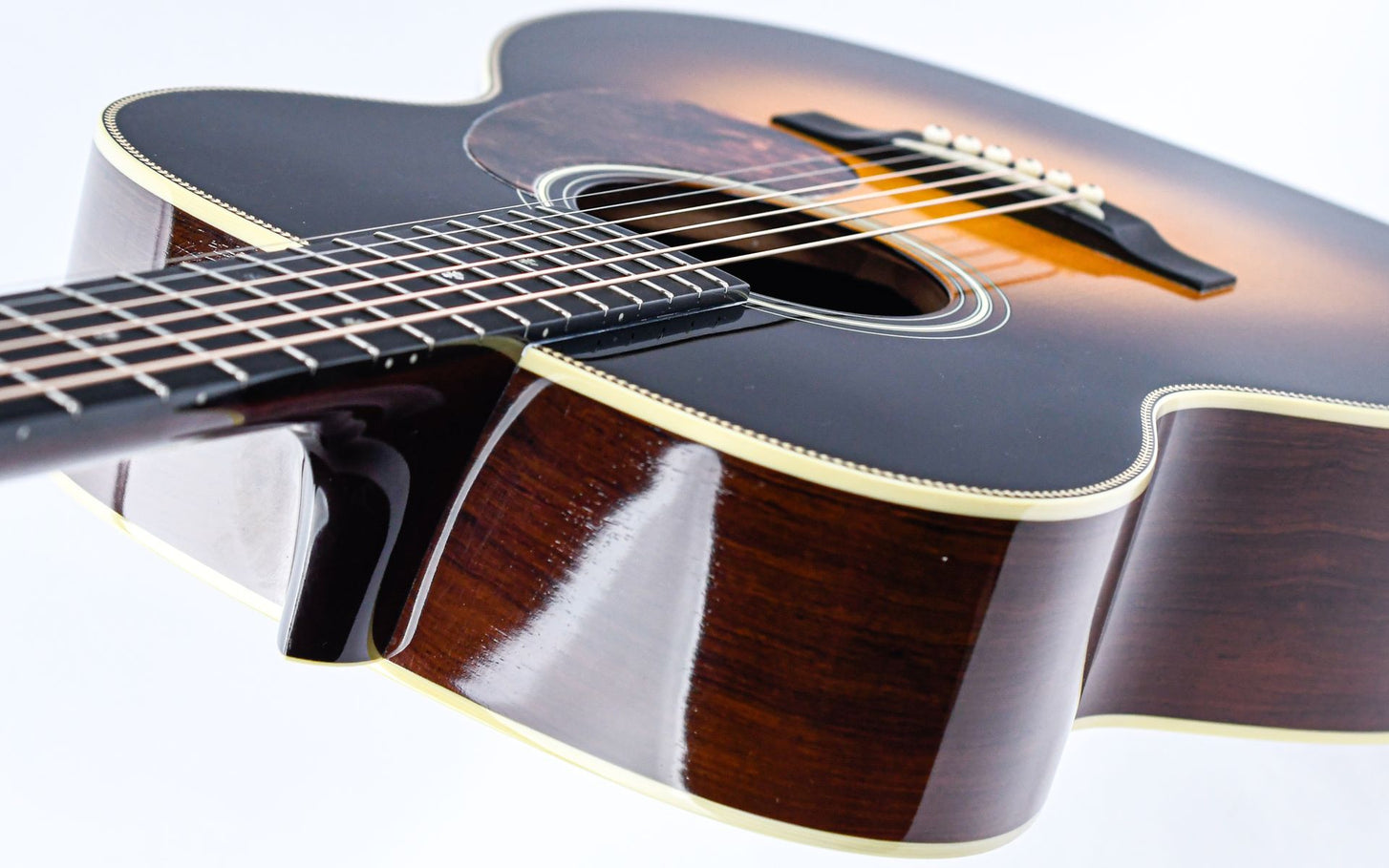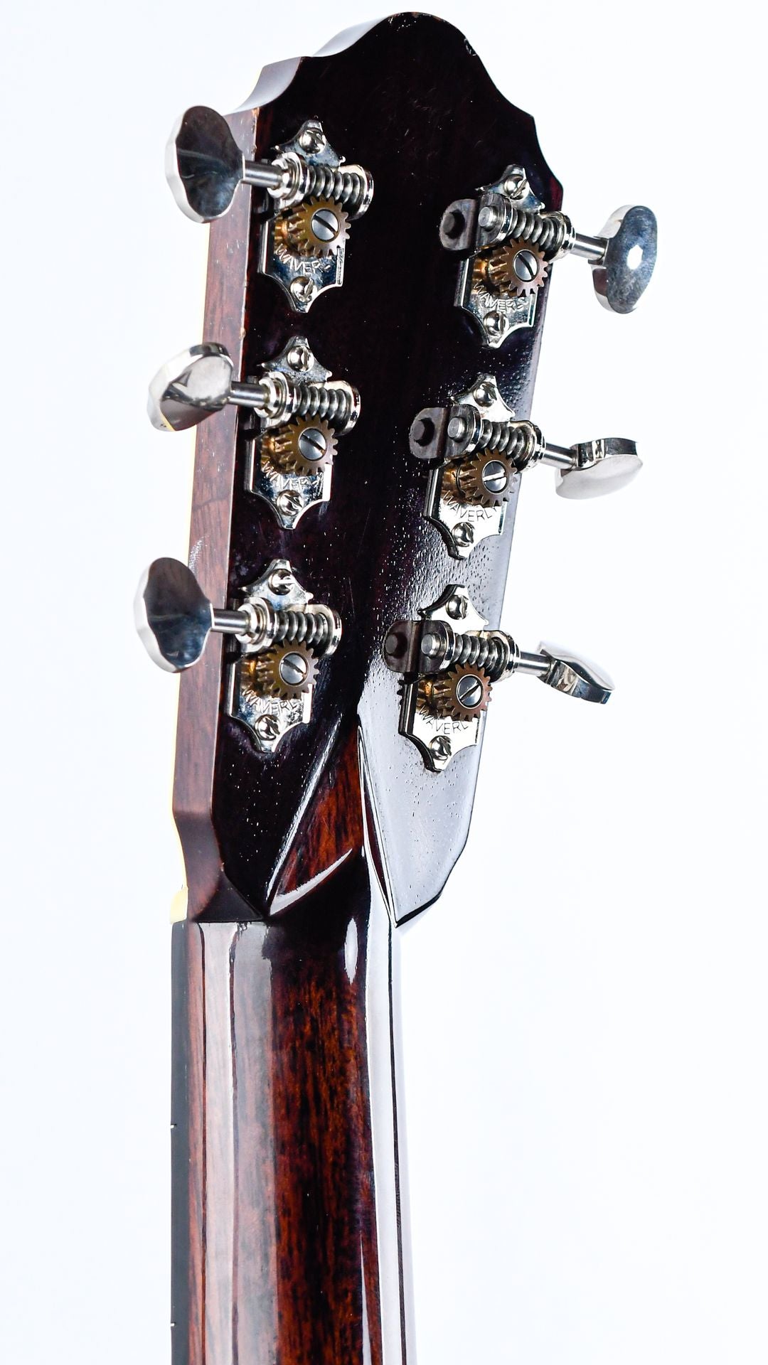 Sie ist in einem warmen Vintage-Sunburst-Finish lackiert und mit eleganten Details wie einer Kopfplatte aus Palisander mit CB-Einlage, einem Knochensattel und -stiften, einem Ebenholz-Griffbrett mit Abalone-Schneeflockeneinlagen, einer Fersenkappe aus Elfenbein, einem Rückenstreifen mit Reißverschluss, einer Style-28-Rosette und einem kleinen Schildpatt-Pickguard ausgestattet. Der modifizierte V-Profil-Hals aus Mahagoni fühlt sich voll, aber bequem an und misst 45 mm am Sattel.