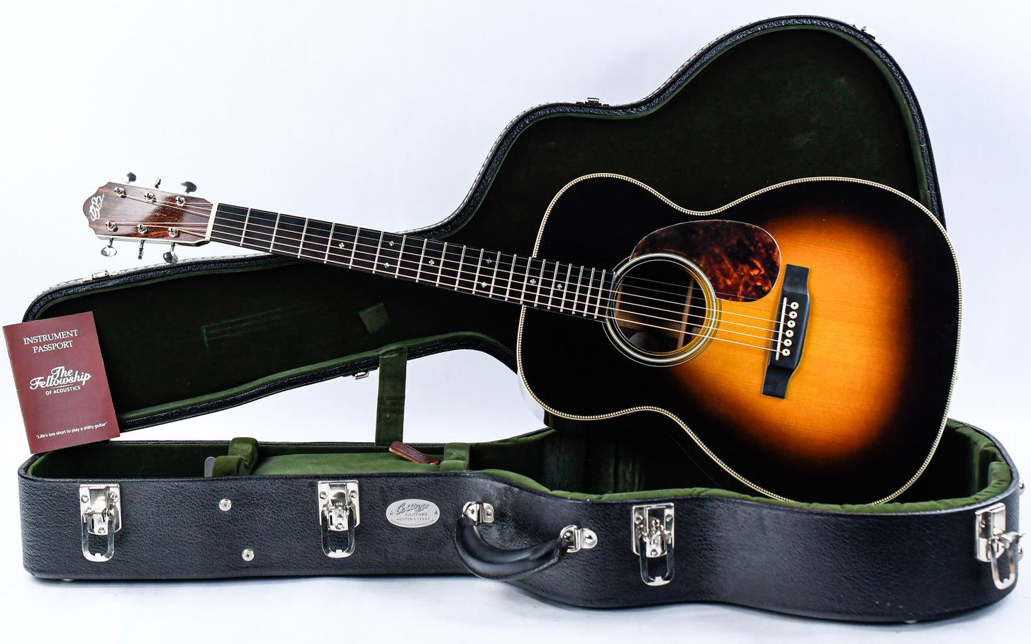 Klanglich hat diese Gitarre eine druckvolle, trockene Vintage-Stimme, die an die Vorkriegszeit erinnert - eine echte Hommage an die großen OMs der 1930er Jahre. Sie ist in einem sehr guten Zustand mit leichten Gebrauchsspuren: Spielspuren an der Decke, etwas Schnallenausschlag am Boden und kleine Dellen an Korpus und Hals. Inklusive Hartschalenkoffer.