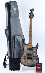 Mit ihrem markanten Trans Jeans Black Burst-Finish und dem hochwertigen Sumpfesche-Korpus liefert die Mayones Aquila V24 S eine moderne Interpretation der klassischen Superstrat. Die Kombination aus geflammtem Ahornhals und Vogelaugenahorngriffbrett, gepaart mit Mayones‘ eigenen Velvetrone-Tonabnehmern, macht sie zu einer vielseitigen Rockmaschine mit ordentlich Power!