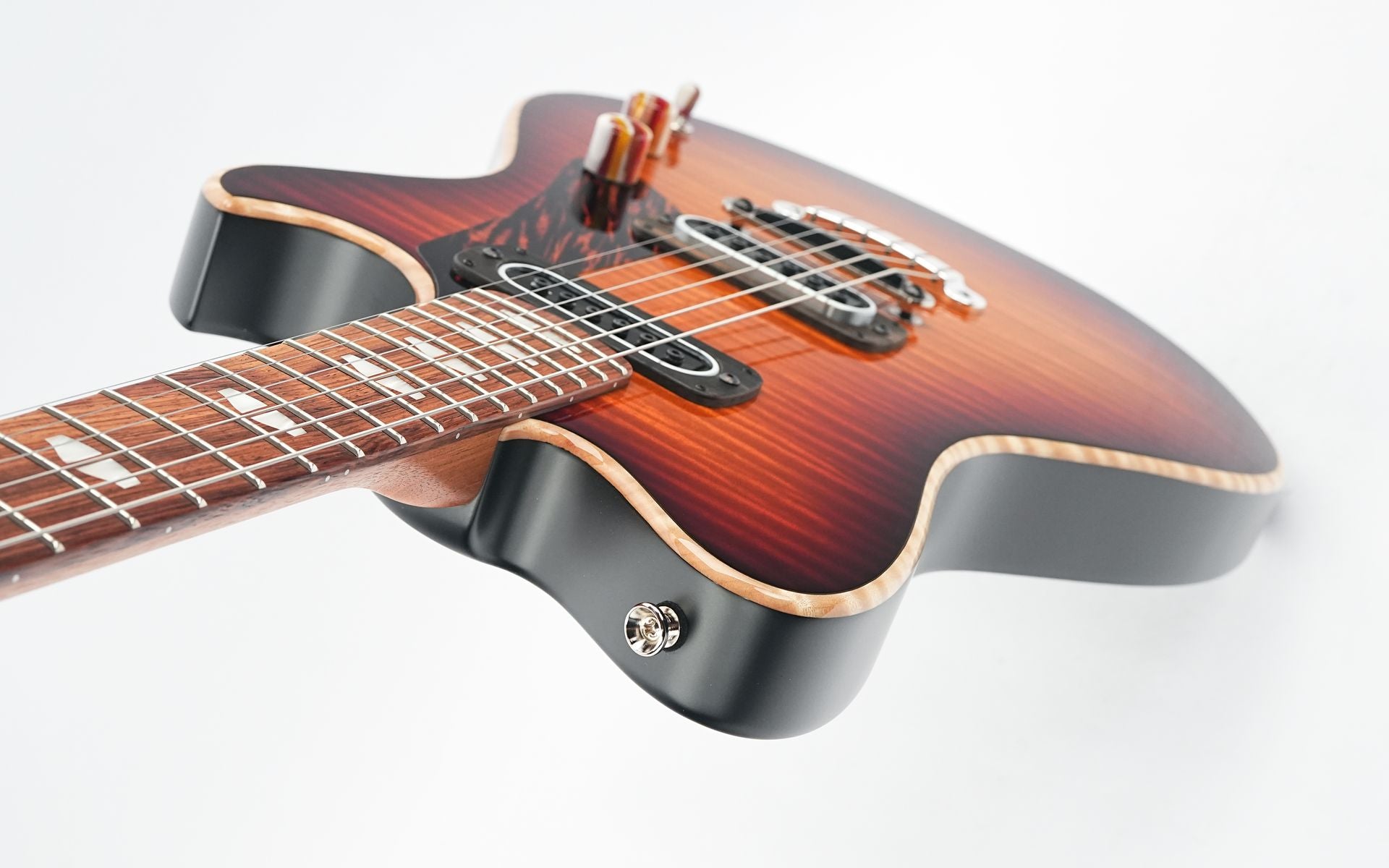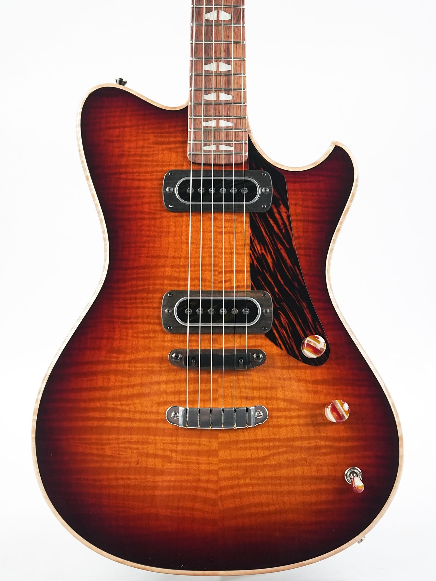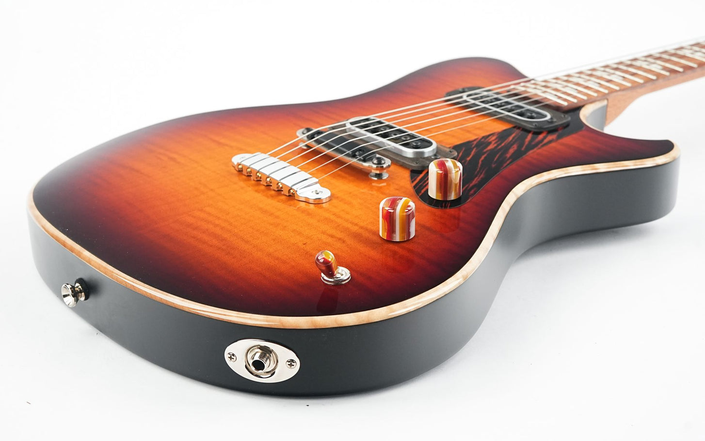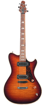 Diese A-Type hat einen Korpus aus Urban Ash mit einer massiven geflammten Ahorndecke. Die Gitarre hat ein Desert Dawn-Finish und verfügt außerdem über elegante Details in Form eines Firestripe-Schlagbretts und einzigartiger Knöpfe aus Schichten von Surfbrettharz. Der Toploader-Hard-Tail-Saitenhalter und die von Andy selbst entworfene Stahlbrücke mit Ebenholzsattel werden von PF42-Single-Coil-Tonabnehmern mit einem soliden, klaren Klang begleitet.