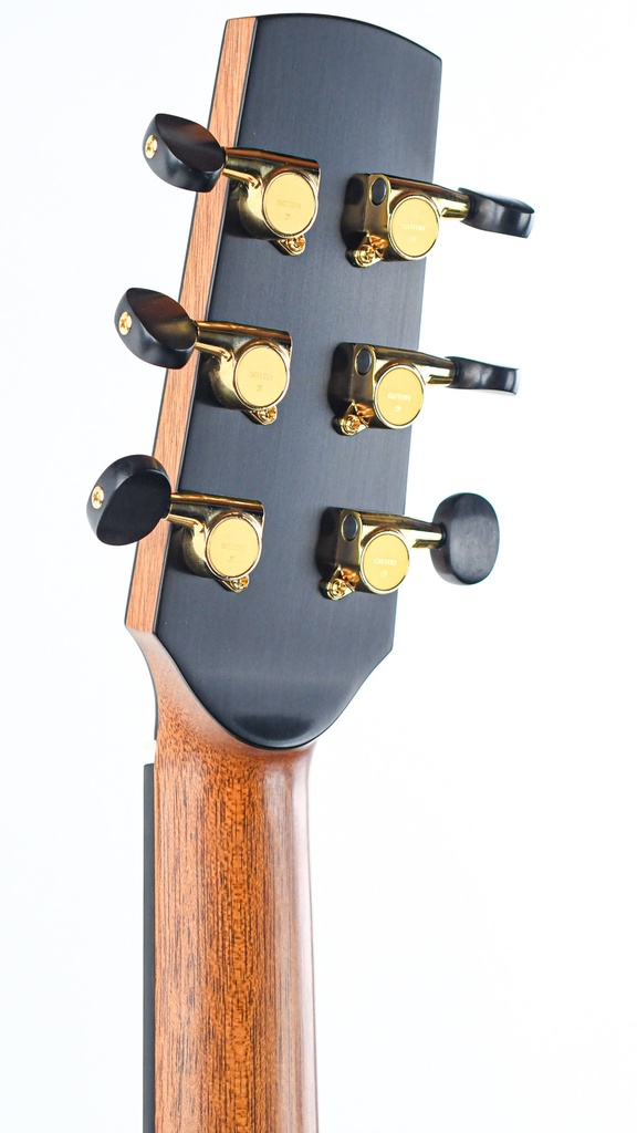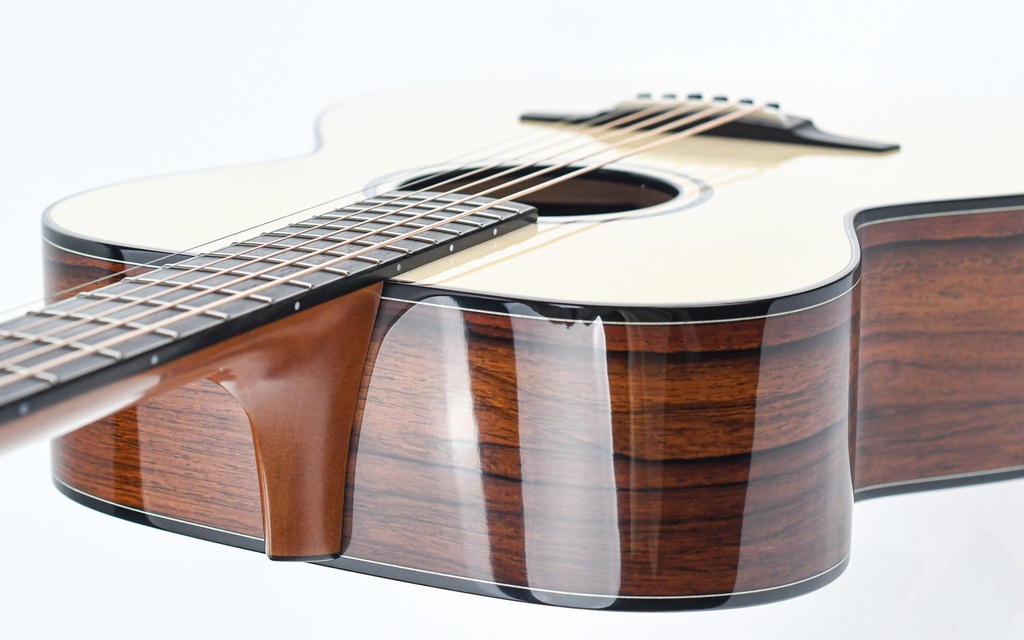 De pracht van het Madagascar-palissanderhout wordt aangevuld door de koa-backstrip en de eindwig. Andere verfijnde details zijn de abalone rozet, houten purfling en gouden Gotoh-mechanieken. De C-vormige mahoniehouten hals is voorzien van een ebbenhouten toets met een radius van 16 inch voor een vertrouwde en comfortabele speelervaring.