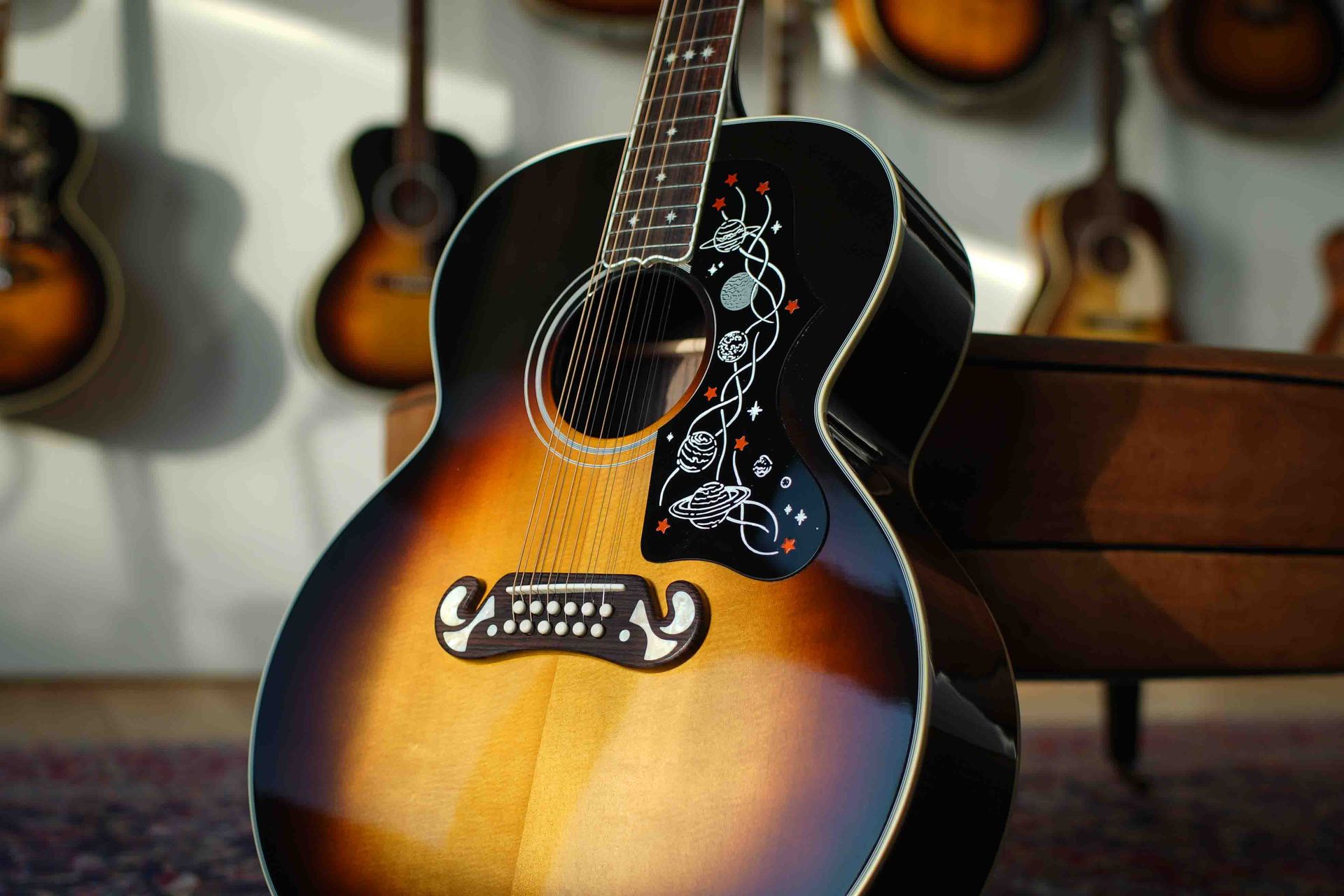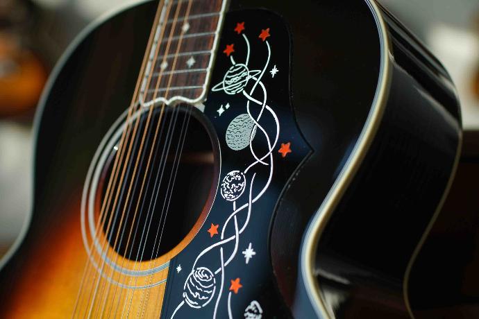 Der Moustache-Steg besteht aus massivem Palisander und enthält vier Agoya-Intarsien im 60er-Jahre-Stil. Das einzigartige Schlagbrett mit Planetenmotiv, das von Sir Brian May selbst entworfen wurde, unterstreicht das astronomische Erscheinungsbild dieser Gitarre. Ein weiteres bemerkenswertes Merkmal ist die umgekehrte Saitenspannung, bei der die dickeren Saiten oben und die Oktavsaite unten sitzen, wodurch im Vergleich zu anderen 12-saitigen Akustikmodellen von Gibson ein einzigartiger und unverwechselbarer Klang entsteht.