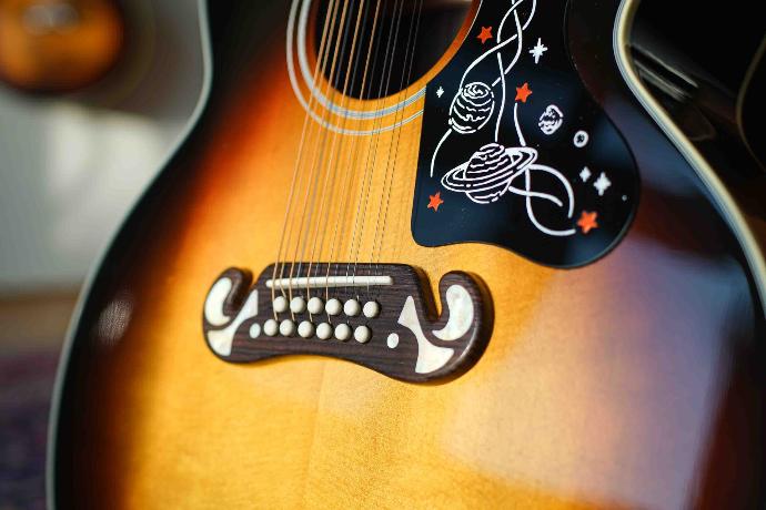 De Moustache-brug is gemaakt van massief palissander en bevat vier 60s-stijl agoya inlays. Het unieke, door Sir Brian May zelf ontworpen, planetair thema pickguard versterkt de astronomische uitstraling van deze gitaar. Een ander opvallend kenmerk is de omgekeerde snarenspanning, waarbij de dikkere snaren boven zitten en de octaafsnaar eronder, wat zorgt voor een unieke en onderscheidende klank in vergelijking met andere Gibson 12-snarige akoestische modellen.