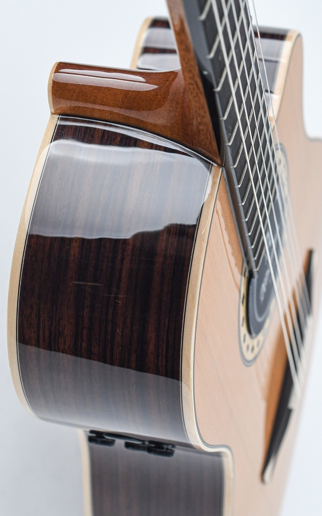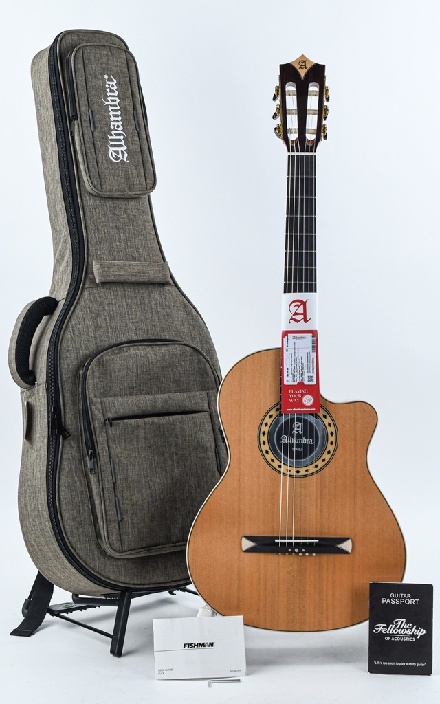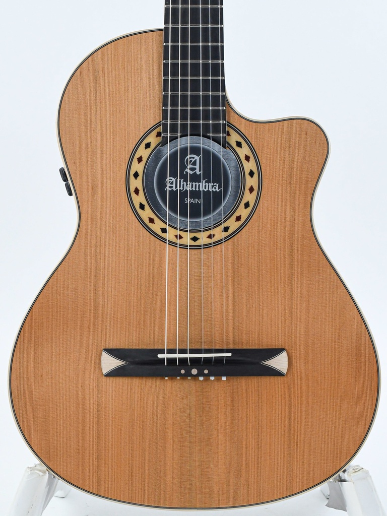 Dankzij het elegante ontwerp van de kop kunnen muzikanten stijl tonen en een geluid projecteren dat past bij het uiterlijk van dit geweldige instrument. Deze Alahambra heeft een Fishman Flex M Blend pickup; deze gitaren hebben een zeer gebalanceerde klank die naar wens van de artiest kan worden aangepast na versterking door een zorgvuldig geplaatst Fishman voorversterkersysteem. Deze Alhambra gitaar heeft een afgeronde toets.