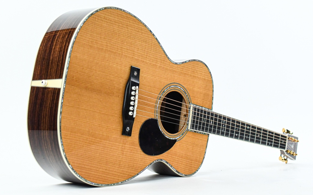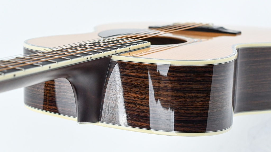 Thanks to the solid Adirondack spruce top combined with a solid Indian Rosewood body, this instrument has a powerful, yet beautifully balanced and round voice. With its great dynamic range, the Orchestra Model can handle everything from subtle to loud; from fingerstyle to solid punch. The versatility of possible playing styles is also aided by the comfortable playability of the mahogany neck with a 'traditional even C' profile and 12 inch ebony fingerboard.