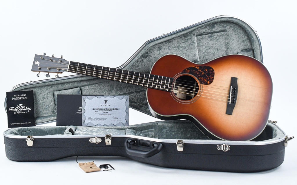 Door het zeer vriendelijke formaat kun je de gitaar gemakkelijker meenemen, en de prachtige sunburst afwerking zorgt ervoor dat je deze Furch Vintage 1 niet snel zult wegleggen. De gitaar wordt geleverd met een certificaat van echtheid in een Hiscox koffer.