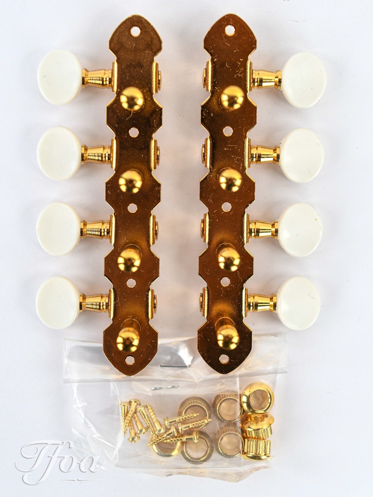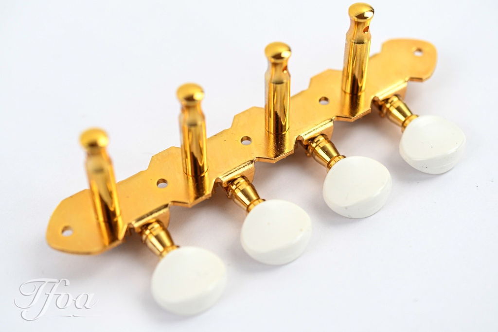 Mandolin A-style machine heads. With a solid peghead (Gibson style), nickel or gold, oval white plastic knob, ratio: 14: 1, shaft diameter: 6mm, bushing: 8.3mm, 23mm string post spacing.