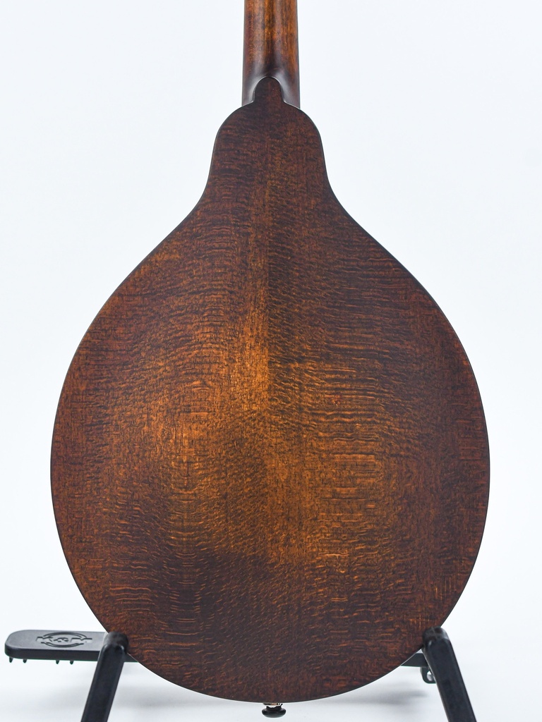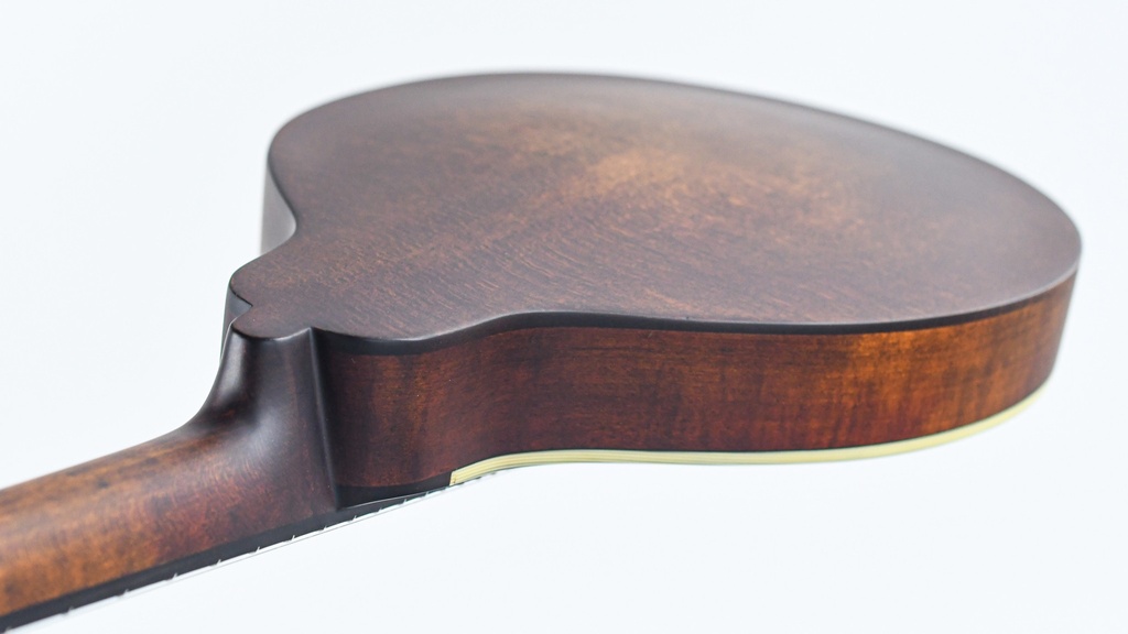 Jedes Instrument wird individuell und in Handarbeit aus traditionellen Materialien und mit echter Handwerkskunst gefertigt. Es verfügt über eine massive Fichtendecke, massiven Ahornkorpus, ein Ebenholzgriffbrett und einen höhenverstellbaren Ebenholzsteg. Der A-förmige Korpus mit ovalem Schallloch sorgt für eine optimale Klangübertragung und exzellente Projektion.
