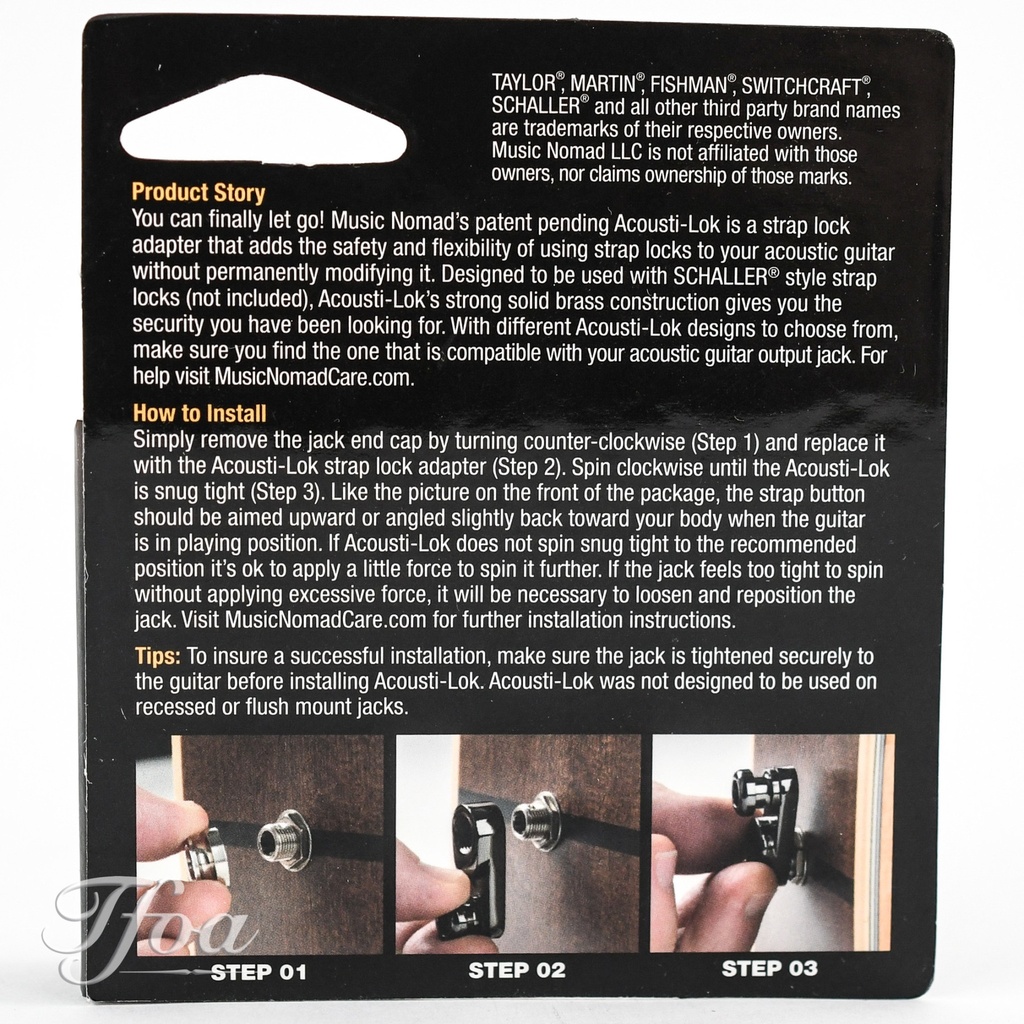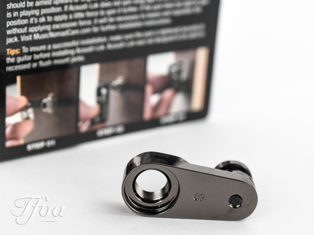 You can finally let go! Music Nomad's patent pending Acousti-Lok is a strap lock adapter that adds the safety & flexibility of using strap locks to your acoustic guitar without permanently modifying it. Designed to be used with SCHALLER® style strap locks (not included), Acousti-Lok's strong solid brass construction gives you the security you have been looking for. With different Acousti-Lok designs to choose from, make sure you find the one that is compatible with your acoustic guitar output jack. Acousti-Lok was not designed to be used on recessed or flush mount jacks.