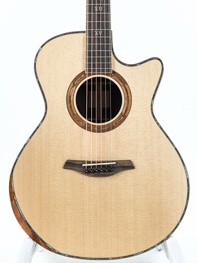 The beauty of these tonewoods is underscored by a resonance enhancing high-gloss finish, as well as a number of decorative details such the binding and premium rosette in koa, abalone purfling and pearl Roman numerals inlay on the fingerboard.