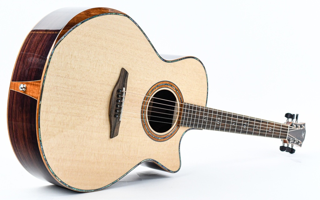 The body is complemented by the ergonomic 'Bevel Duo' in koa which provides maximum comfort even during extended play.
