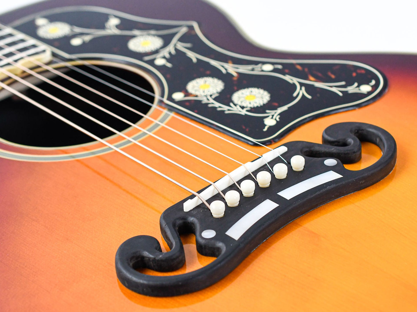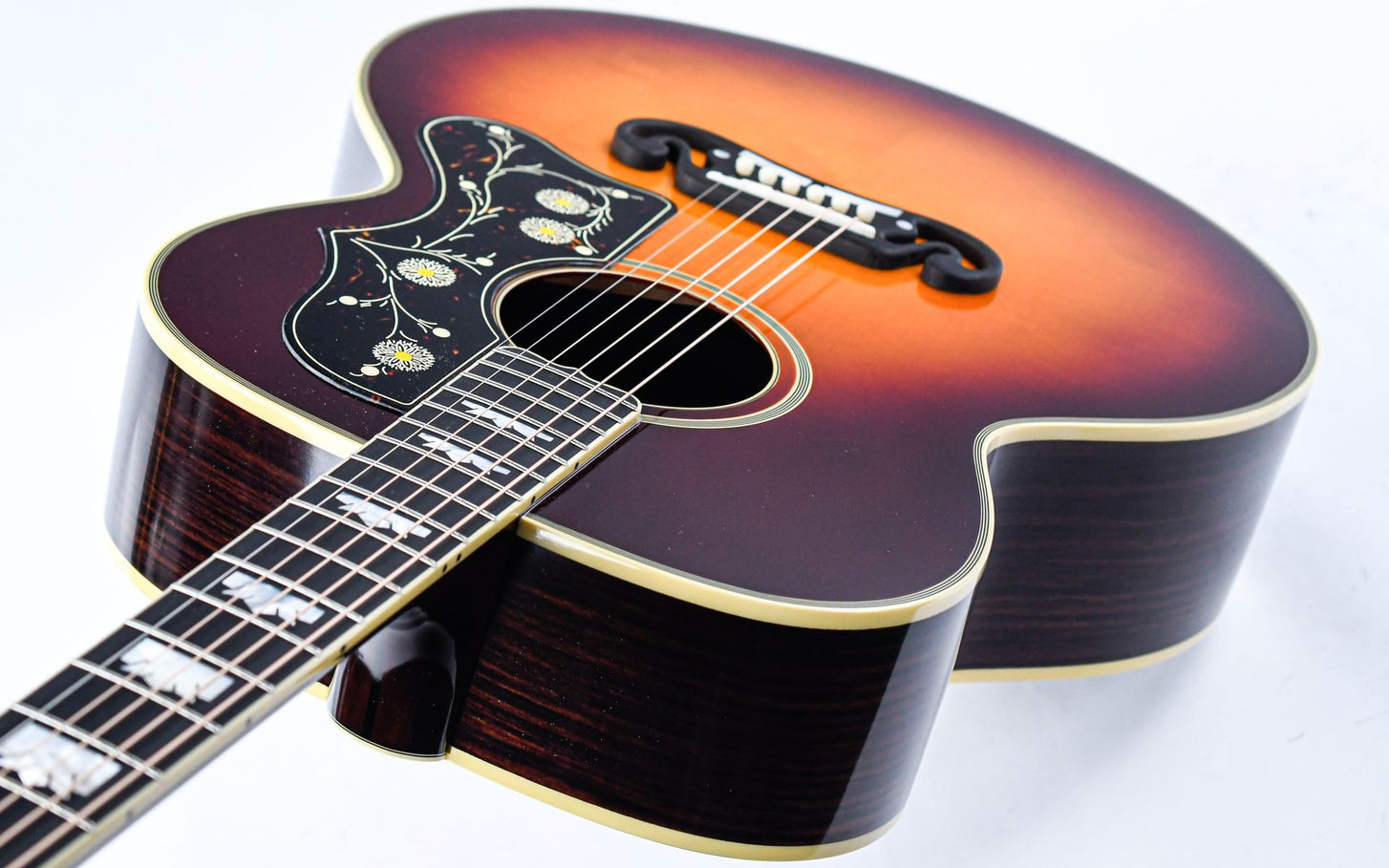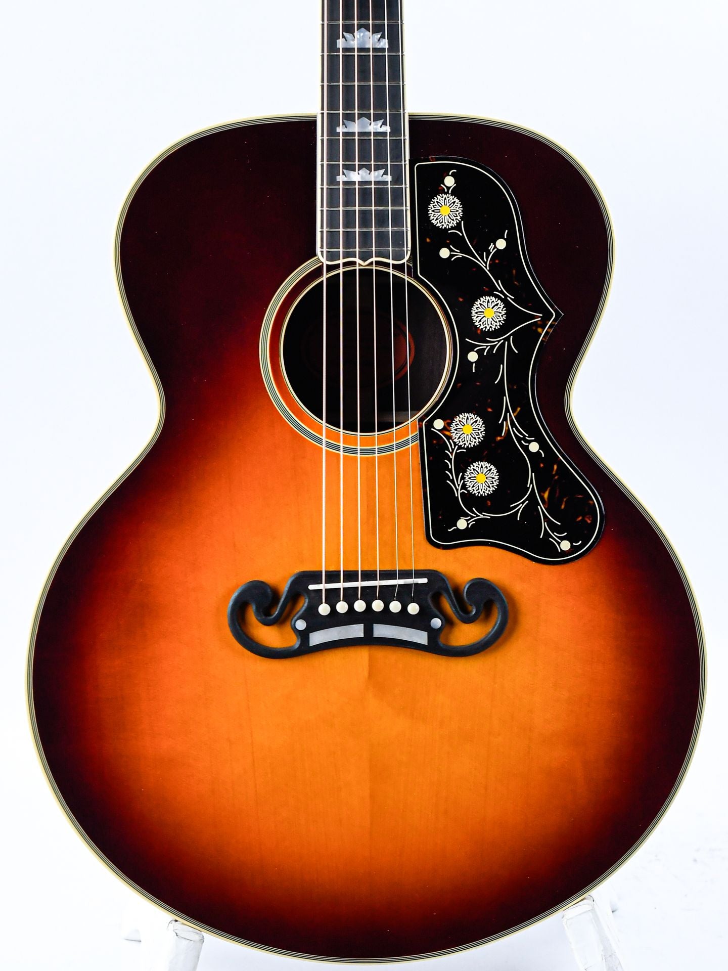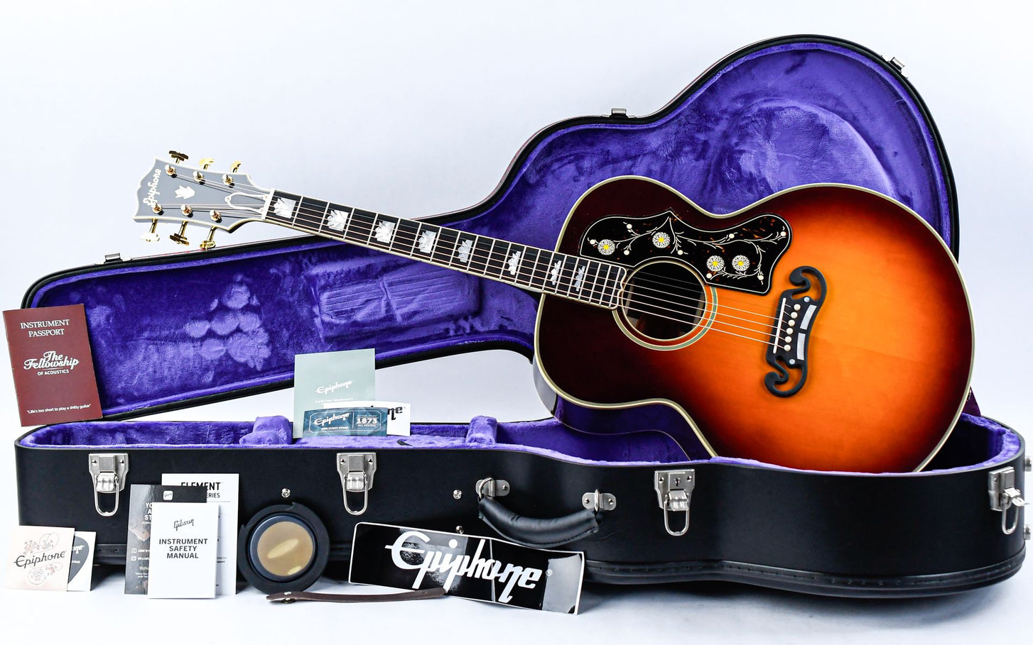 Introduced in 1937 as Gibson’s flagship acoustic guitar, the SJ-200 became known as “The King of the Flat-tops.”Originally developed for country legend Ray Whitley, the model was soon embraced by artists such as Elvis Presley, Bob Dylan, and The Beatles. This Epiphone reissue honors the pre-war specifications of the original design, including the distinctive moustache bridge and the striking graduated crown inlays that give the guitar its regal appearance.