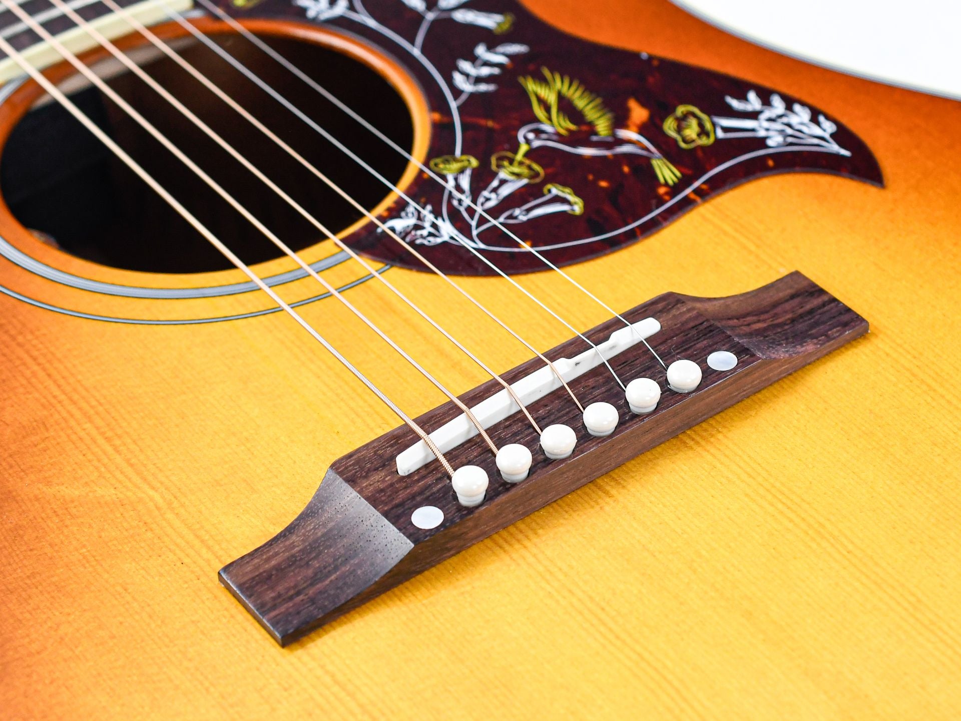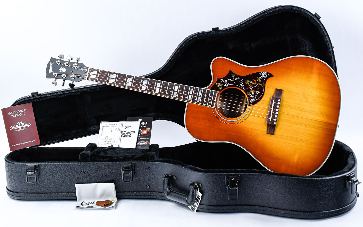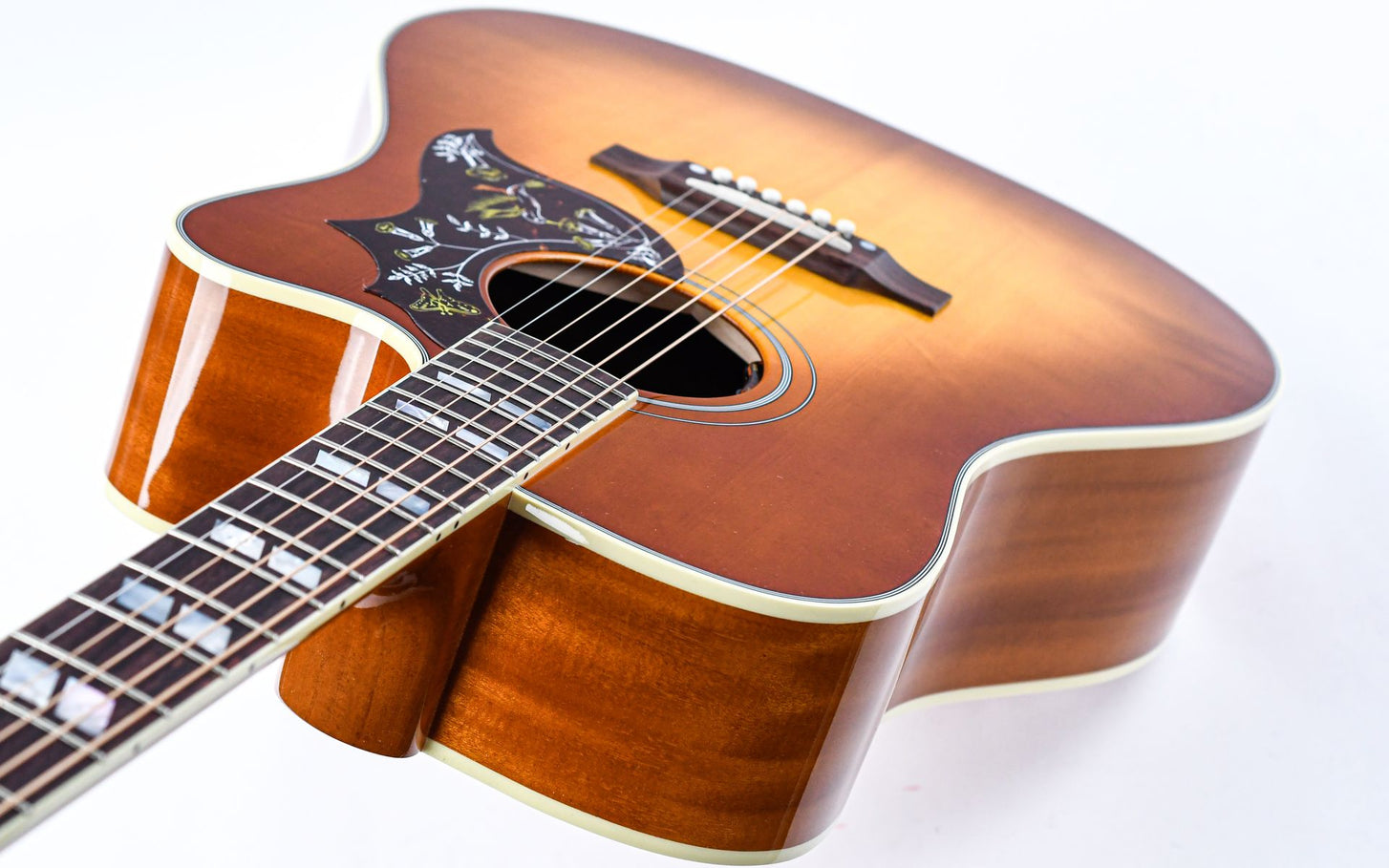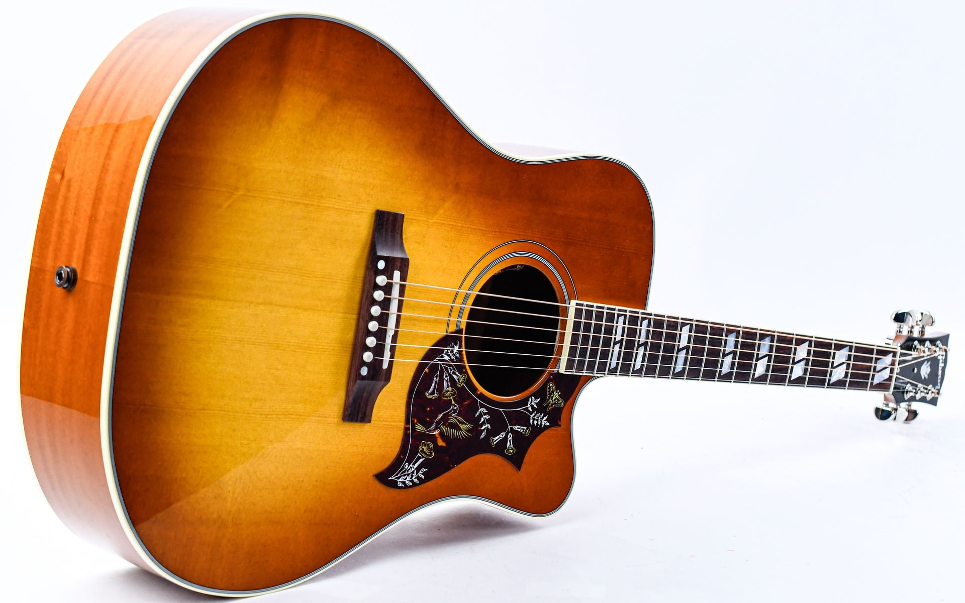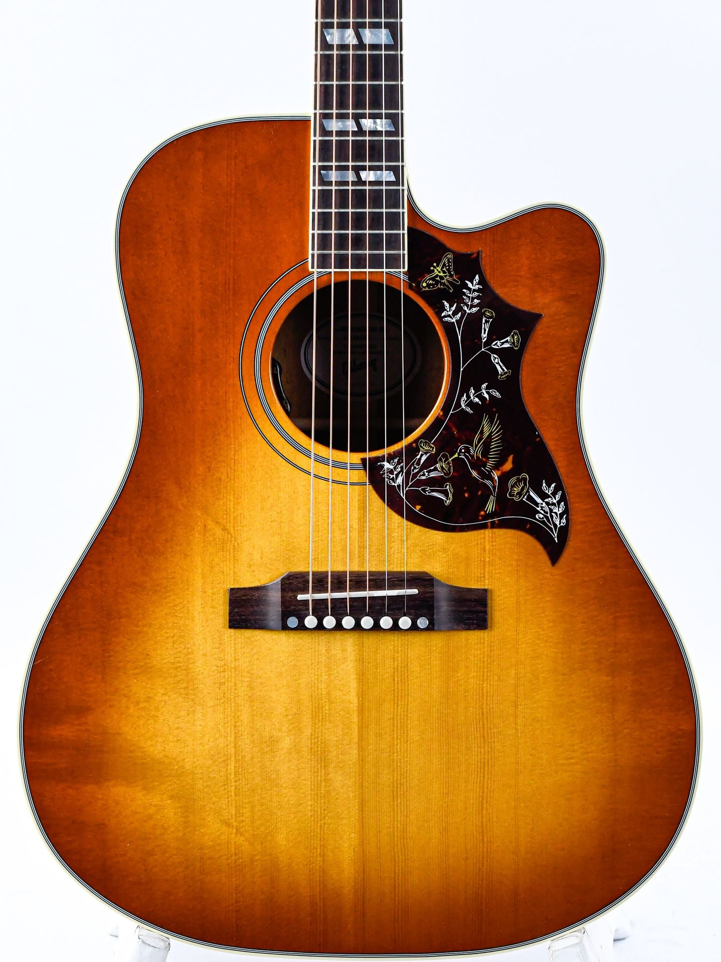 Introduced in 1960, the Gibson Hummingbird is one of the most distinctive and beloved acoustic guitars ever made. This cutaway version adds even more playability and access to the higher frets.