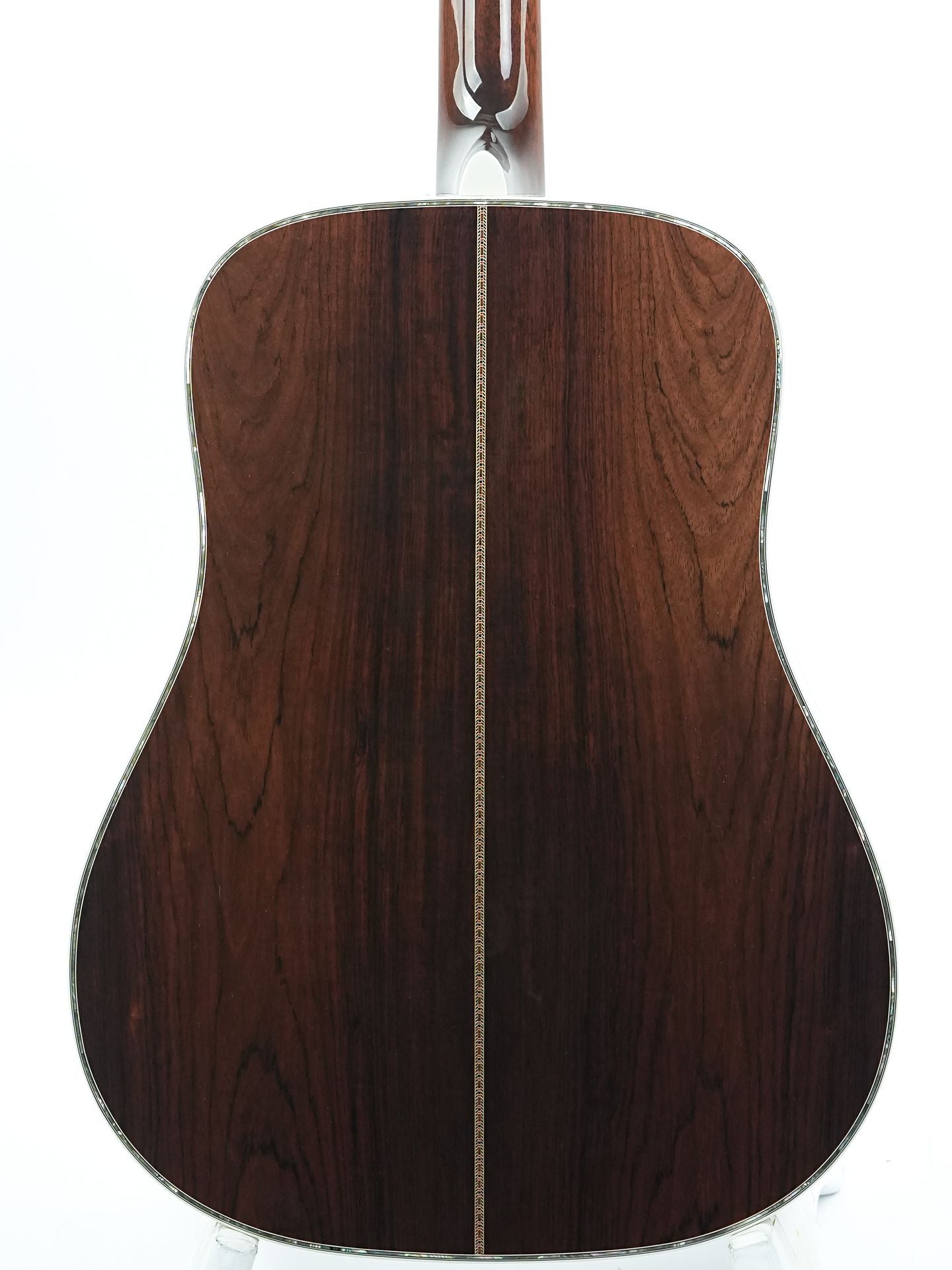 The binding on the top of the headstock has two small cracks, and on the side of the headstock, we find very small hairlines in the finish along the binding. The finish on the sides of the nut has also discolored, presumably due to a stand or wall hanging. The guitar is currently playable, but given the neck angle, a neck reset in the near future cannot be ruled out. These are signs of the guitar's now quite advanced age, which is nevertheless exceptionally beautiful. With its beautiful sound and appearance, this D45 is an absolute asset to the collection of any collector and guitarist who only wants the very best!