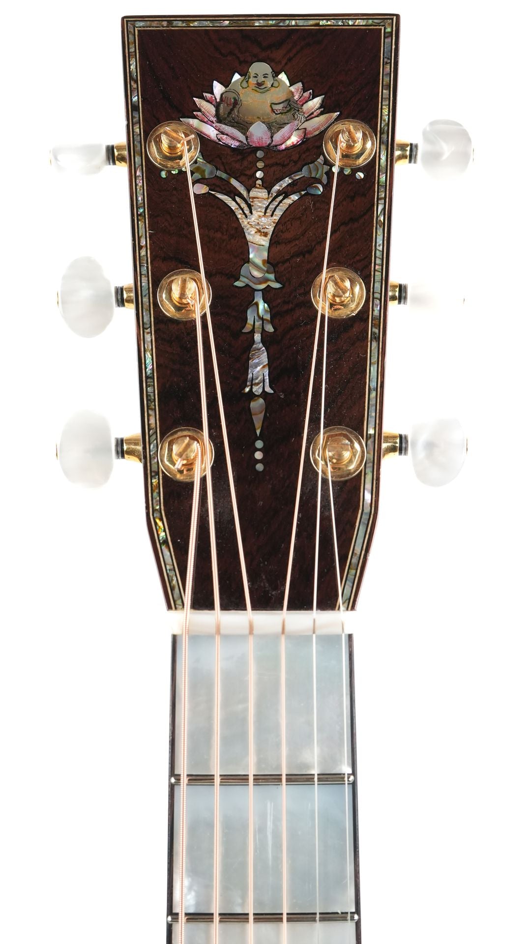 Rozawood is the project of Czech guitar craftsman Roman Zajicek, known for his exceptional attention to detail and his ability to push the boundaries of guitar building. For the 'Buddha', he collaborated with Rudi, where the design was aimed at the absolute maximum from the outset: the best materials, the most refined finish, and a coherent visual identity that allows the guitar to speak as a work of art as well. The name 'Buddha' refers to the central theme that is not only visible on the headstock but recurs throughout the entire guitar: from the yin-yang dot inlay on the fretboard to the abalone lotus flowers in the rosette and a mantra in 24-karat gold on the fretboard.