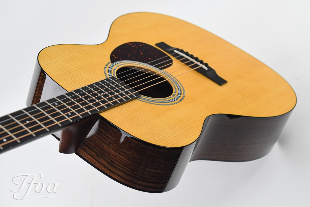 The OM-21 is part of the Martin Standard line-up and an iconic model for Martin. This keeps the build faithful to one of the guitar's earlier designs. It has an ebony bridge and fingerboard, scalloped X bracing, and the neck is 44.5mm or 1 3/4 "wide. The OM-21 is a comfortable guitar for those who don't want a big body, but want a big sound.