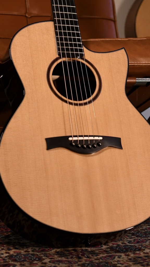 Lowry limits himself to two models: Braid and Carrick. The Braid is the smaller model and this is Andrew's unique interpretation of 00 with a somewhat unusual 13 frets to the body for the perfect bass notes. Small, great sounding and very comfortable to play for hours.
