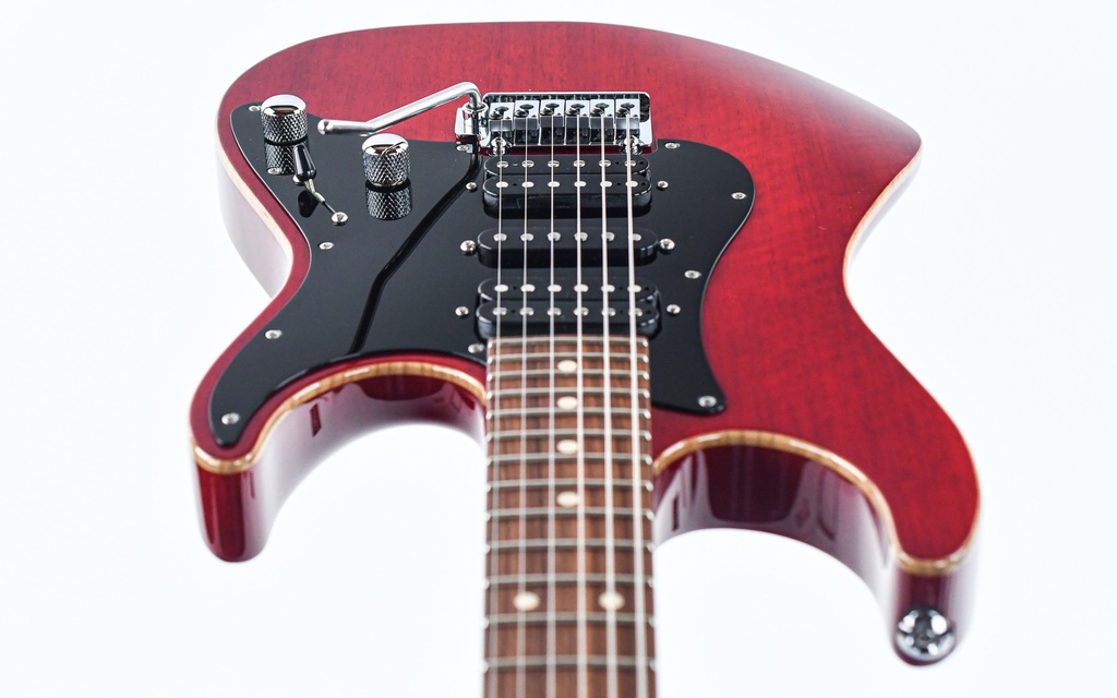 This is also a gem of the master! One of John's all-time favorite woods, White Limba is the heart of his Signature Series guitar. The Trans Red finish, nicely rounded binding and black bakelite pickguard provide an unmistakable and stylish appearance. The white Limba body is chambered and embellished with Chrome hardware which completes the undeniable eighties look.