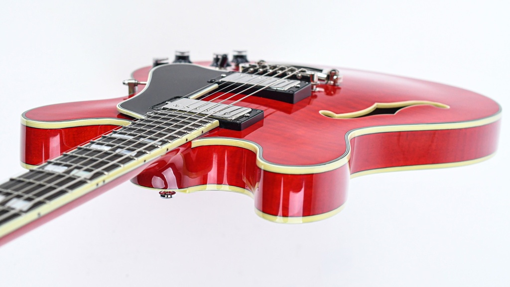 This semi-hollow guitar features a top-quality laminated maple body. It is versatile, responsive, with a lot of sound and a healthy amount of power. It has that distinctive humbucker sound provided by the Seymour Duncan Jazz and 59 pickups. The centerblock ensures that feedback is prevented and brings this semi-hollow a bit closer to a solidbody guitar.