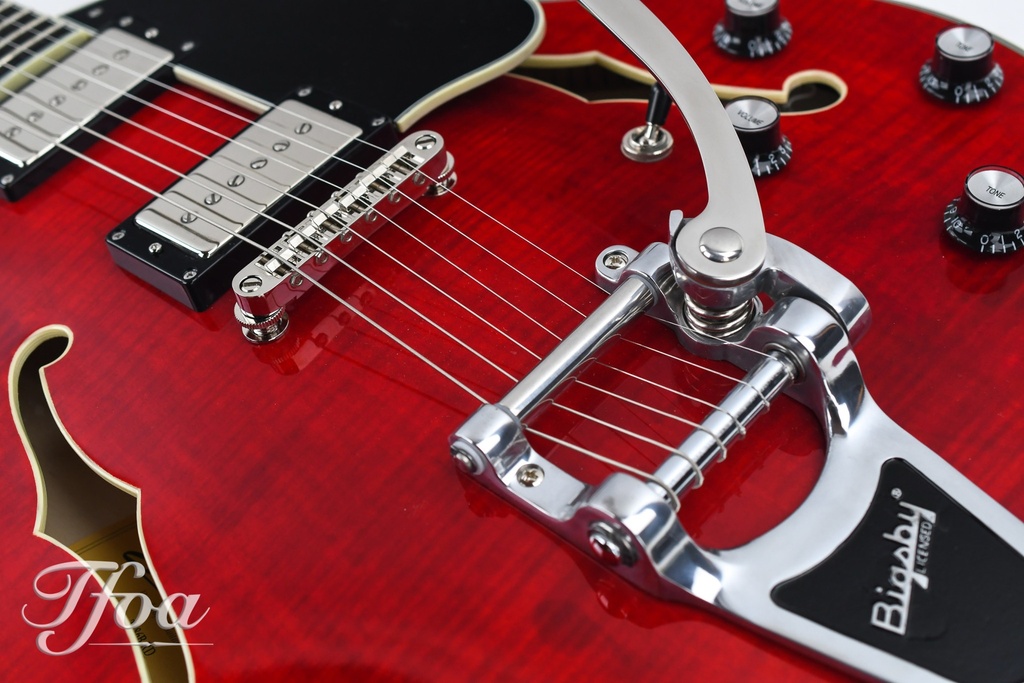 Fitted with Seymour Duncan Phat Cat pickups in both the neck and bridge positions, this guitar delivers a versatile range of tones, from warm jazz to gritty blues. The hardware, including a Bigsby Licensed Vibrato B70 tailpiece and Gotoh Tuneomatic bridge, ensures reliable performance and tuning stability. Finished in Truetone Gloss, the T486B exudes a timeless aesthetic, further enhanced by its ivoroid binding and elegant split block parallelogram inlays.