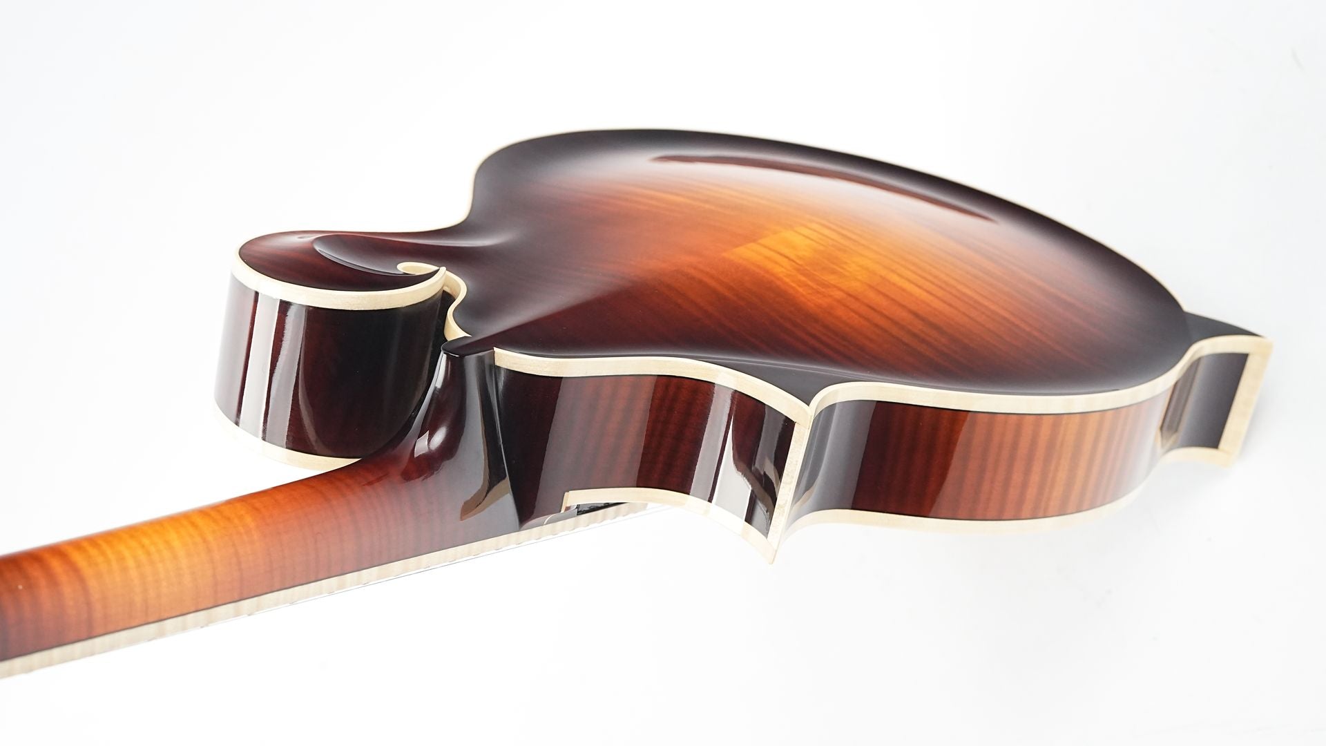 Wat direct opvalt aan deze Persephone is het uitzonderlijke vakmanschap in de body-carving. De scherpe, oplopende randen van de klankkast en alle carved details zijn met chirurgische precisie uitgevoerd, wat niet alleen visueel indrukwekkend is maar ook bijdraagt aan de akoestische eigenschappen!