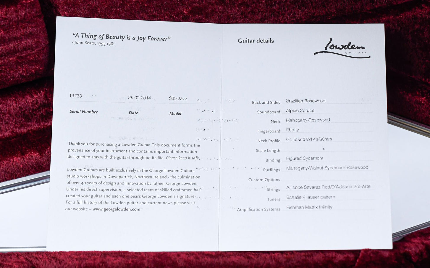 De gitaar heeft een unieke combinatie van houtsoorten; met prachtig Braziliaans palissander en fijngenerfd Alpine sparren is dit één van de meest exclusieve uitvoeringen van Lowden's crossover Jazz serie. De Lowden S35J is zodanig ontworpen zodat de gitaar zeer comfortabel aanvoelt voor zowel klassieke als staalsnarige spelers.