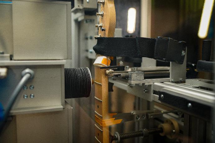 De machine scant de gitaarhals met behulp van geavanceerde sensoren. Deze sensoren meten de exacte vorm en conditie van de hals, inclusief eventuele onregelmatigheden.