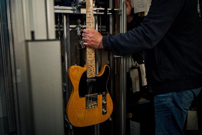 Een PLEK machine ziet eruit als grote, glazen vitrinekast met een flink rek waar je een akoestische of elektrische gitaar in kunt hangen. Maar in die kast gebeurt van alles, dankzij superslimme, laser gestuurde scan-technieken én haarfijn afstelgereedschap.