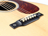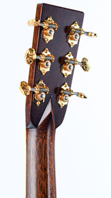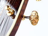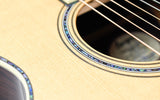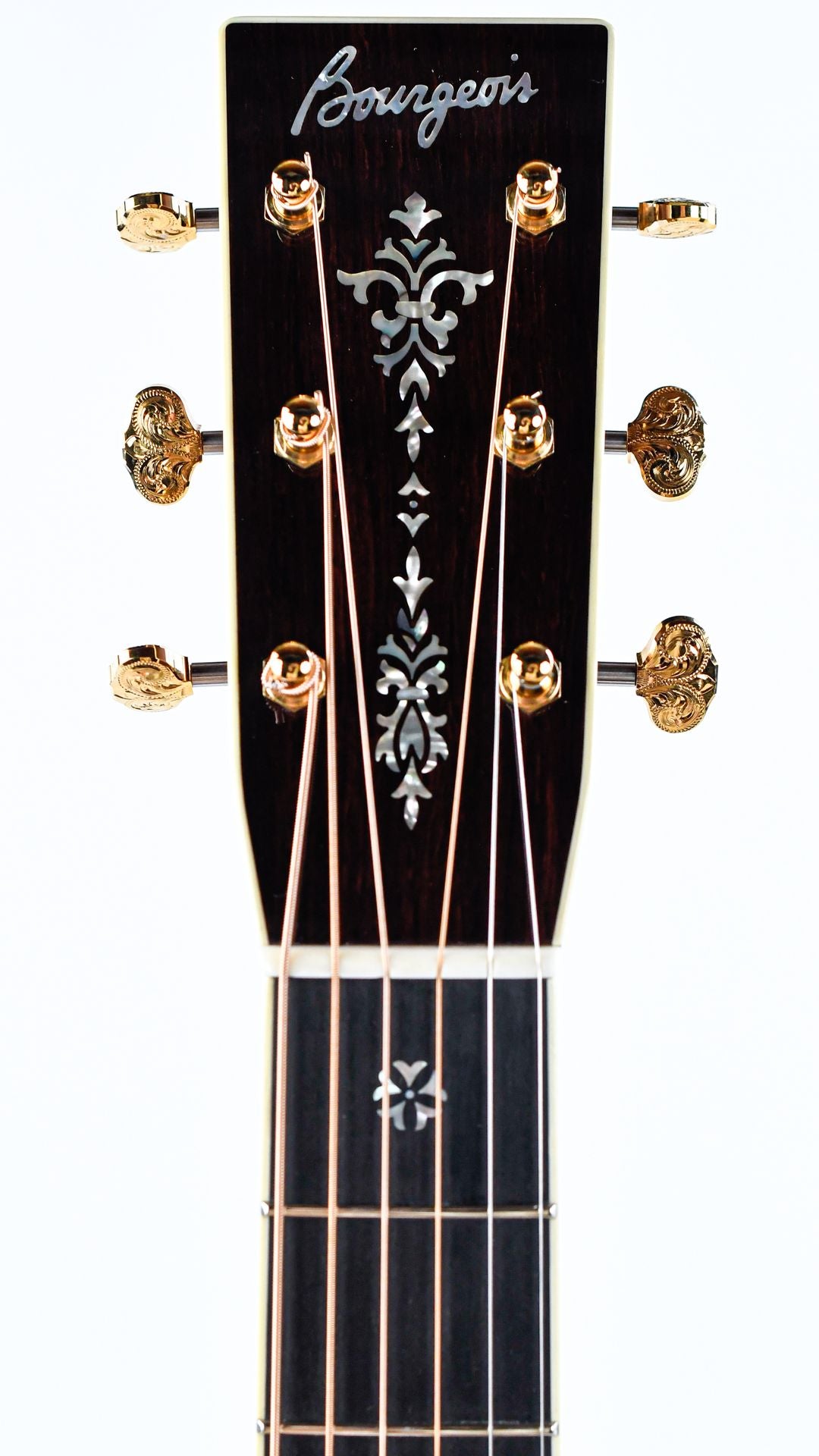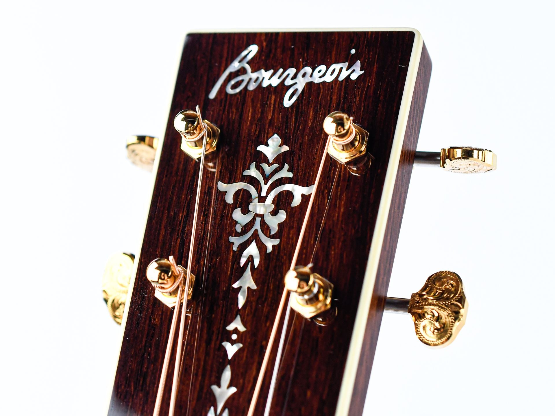 In terms of details, this Bourgeois also scores high; The headstock is made from the same Madagascar rosewood as the body, and the rosette and purfling are beautifully inlaid in the 42 style. The mahogany neck has a comfortable profile, and has an ebony fingerboard with a compound radius. Here we find a beautifully detailed abalone Snowflake inlay, and the neck has an ivoroid binding like the body.