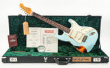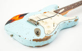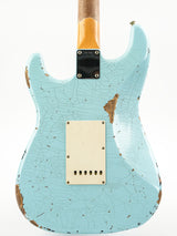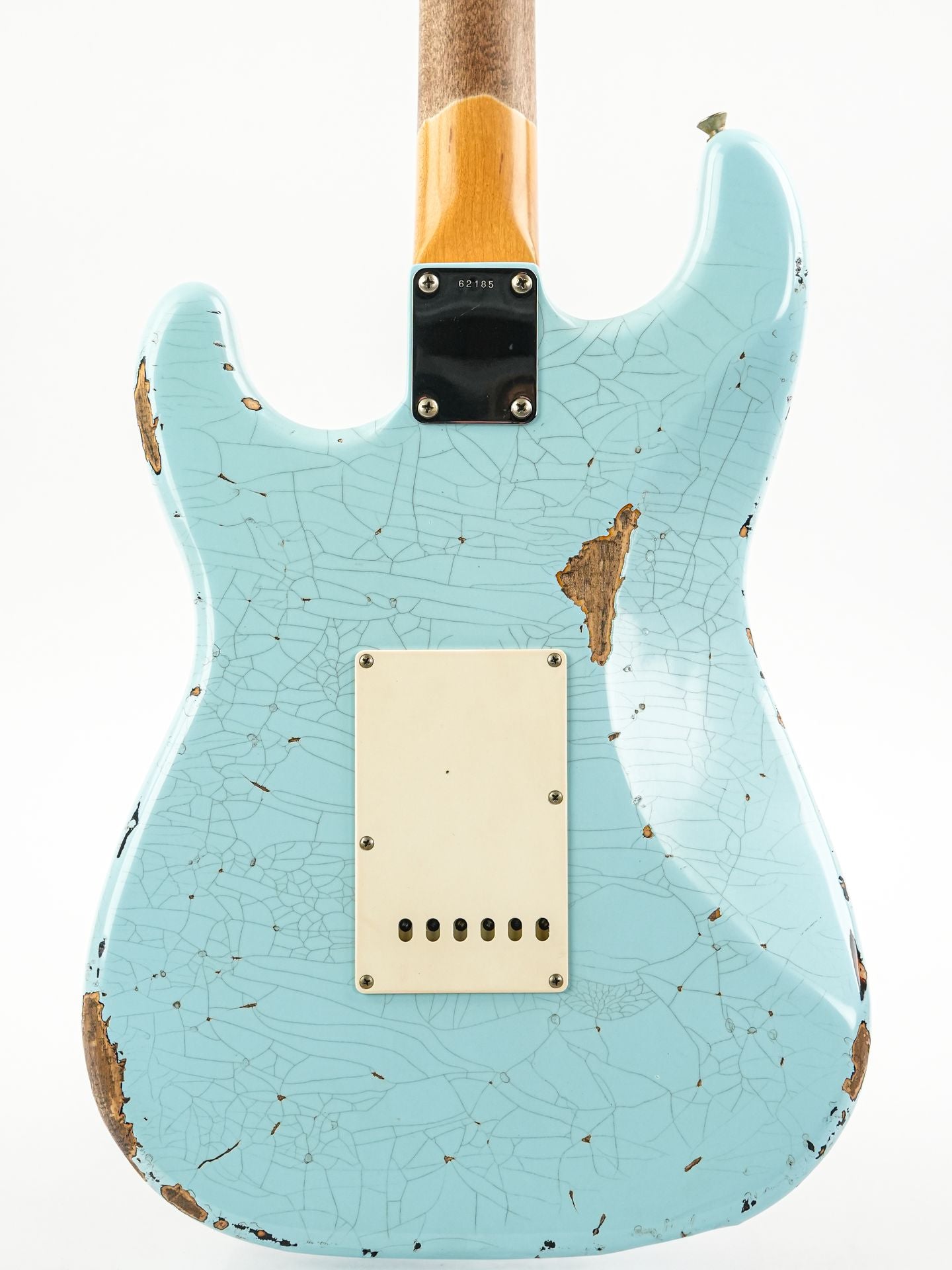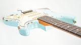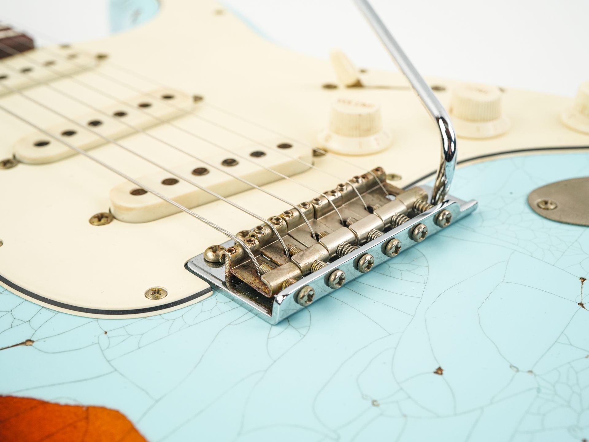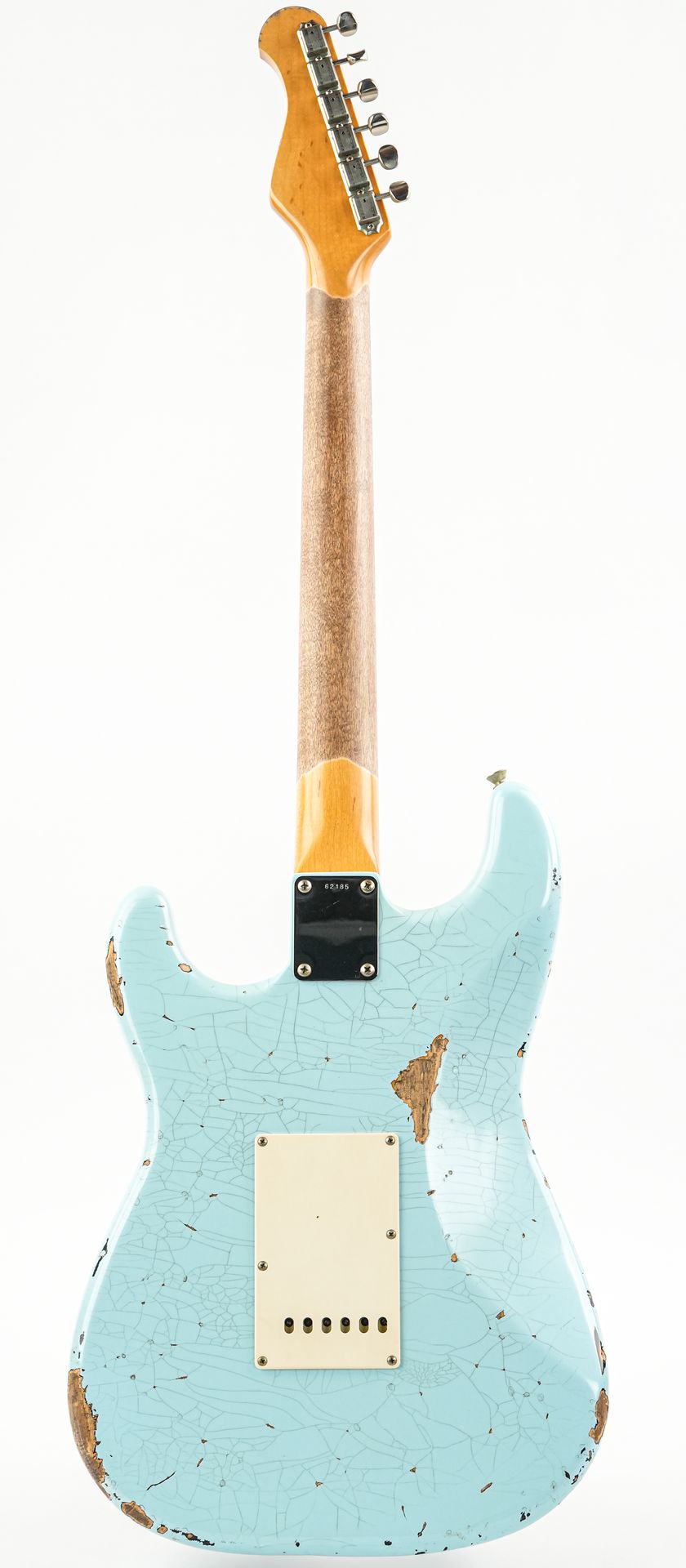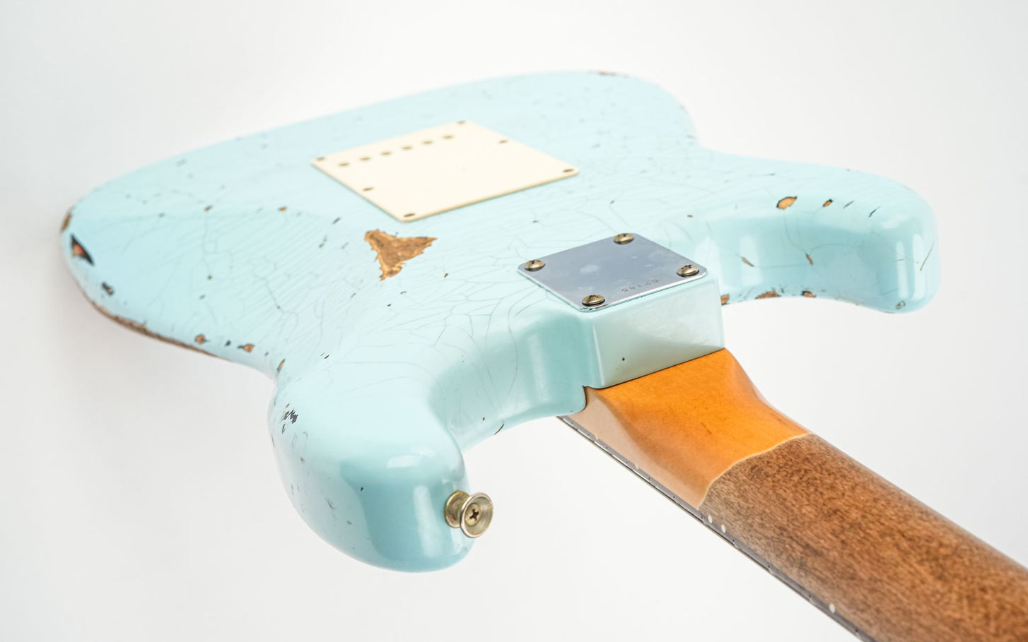 The wood for the guitars is carefully selected to ensure optimum sound quality and playability. For this S-Style, we chose a two-piece body made of Abachi that features a gerelicte Daphne Blue over Sunburst finish. This finish authentically mimics the worn-in and lived-in look of vintage guitars, adding aesthetic charm and character to the guitar.
