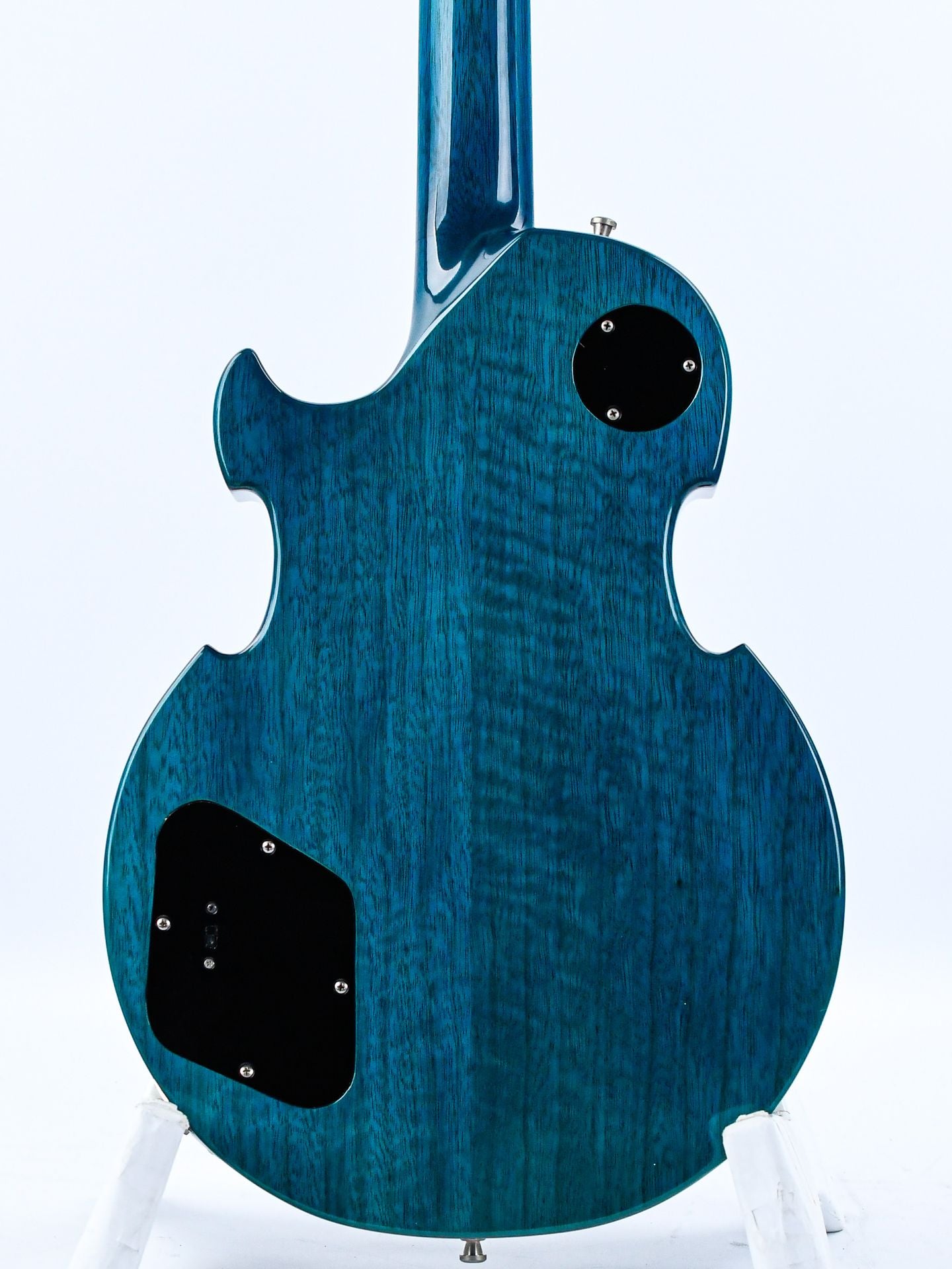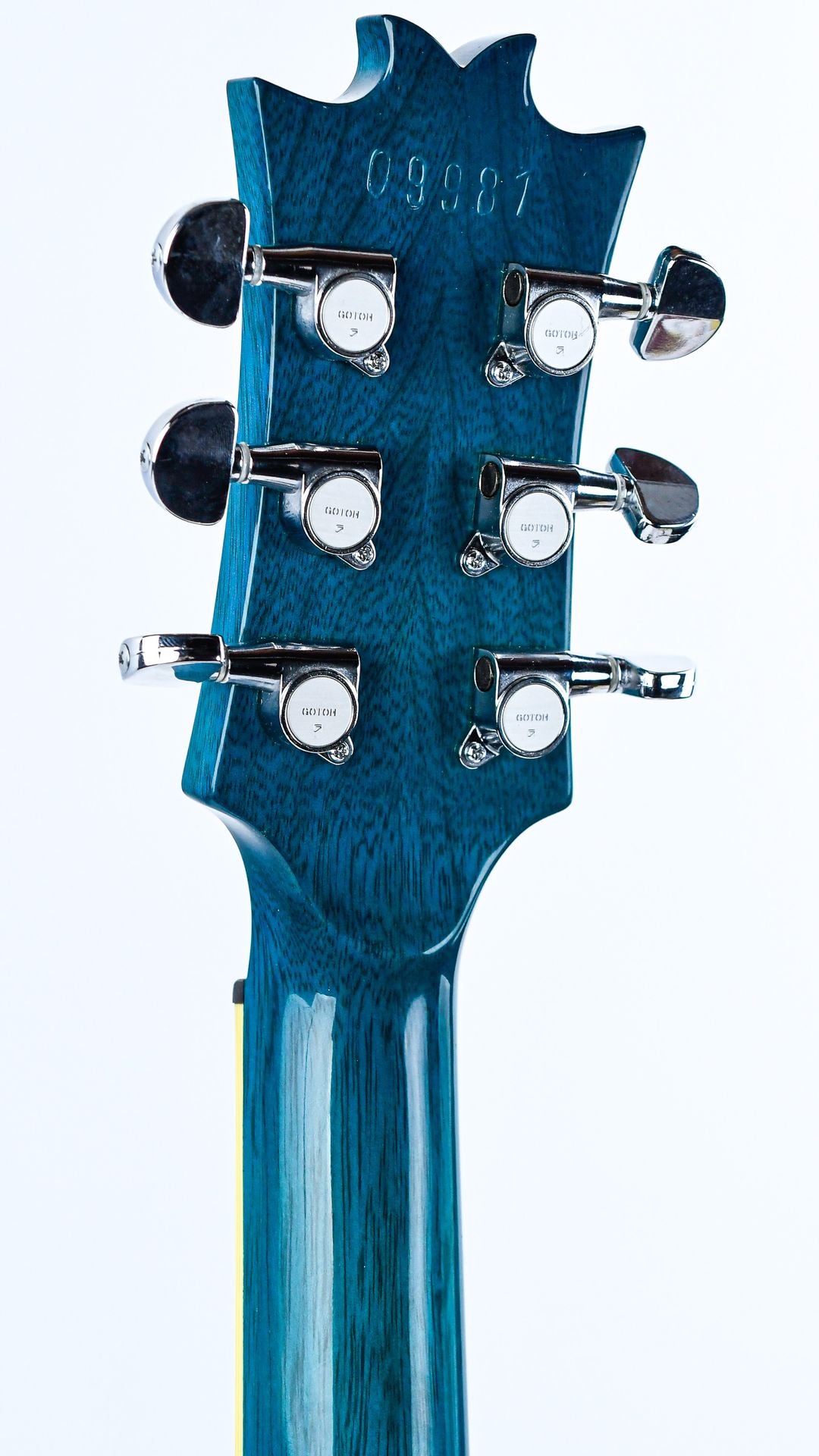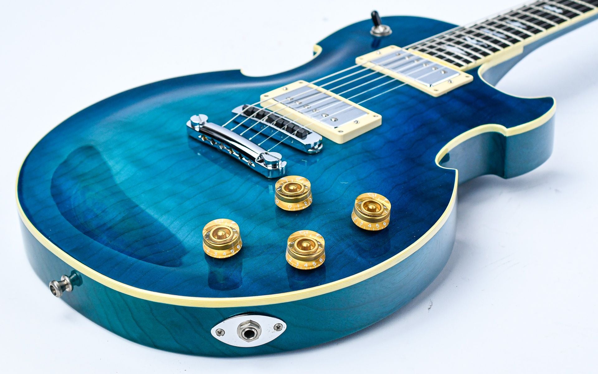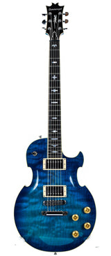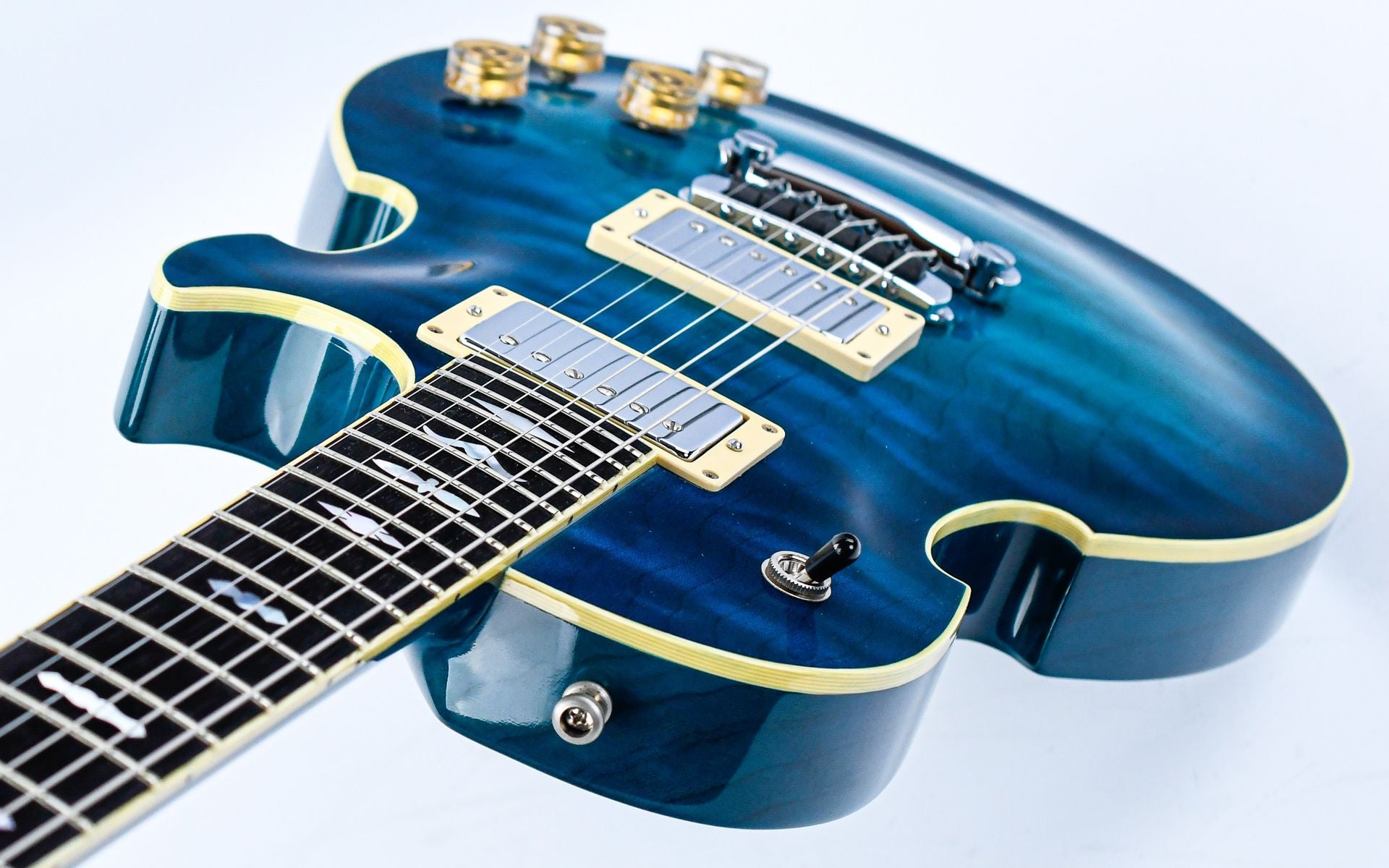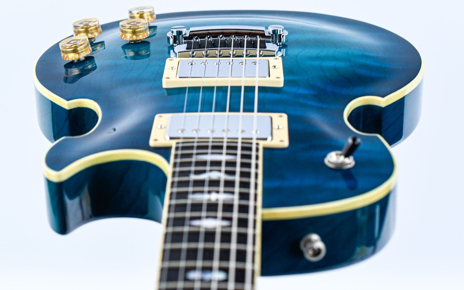 The Lizard Hybrid is an unprecedentedly versatile guitar by Dommenget, and with its quirky design, it is a huge eye-catcher. The guitar has a Korina body with flamed maple top in a striking Blueburst finish with ivoroid binding. The mahogany neck has an ebony fingerboard with beautiful mother-of-pearl inlays. The two humbuckers are accompanied by a piezo element that can be switched on both together and separately from the humbuckers for a wide array of sounds.