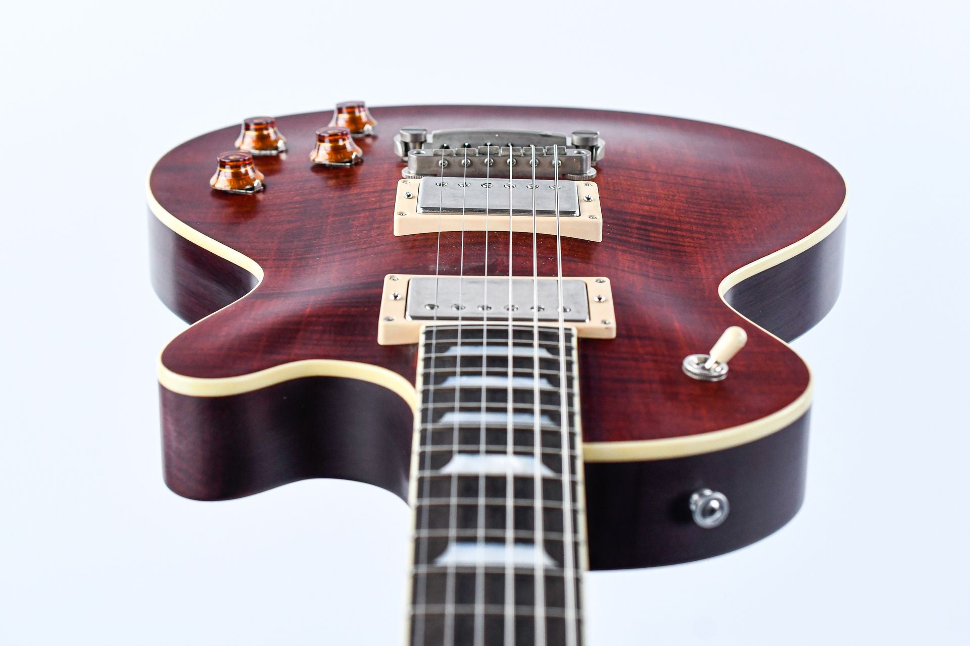 This handcrafted guitar, built using traditional methods with carefully selected materials, embodies craftsmanship at the highest level. The SB59 features a one-piece okoumé body with a solid, hand-carved maple top. The comfortable C-shaped okoumé neck, also made from a single piece, and the ebony fingerboard with mother-of-pearl inlays provide a sublime playing experience.
