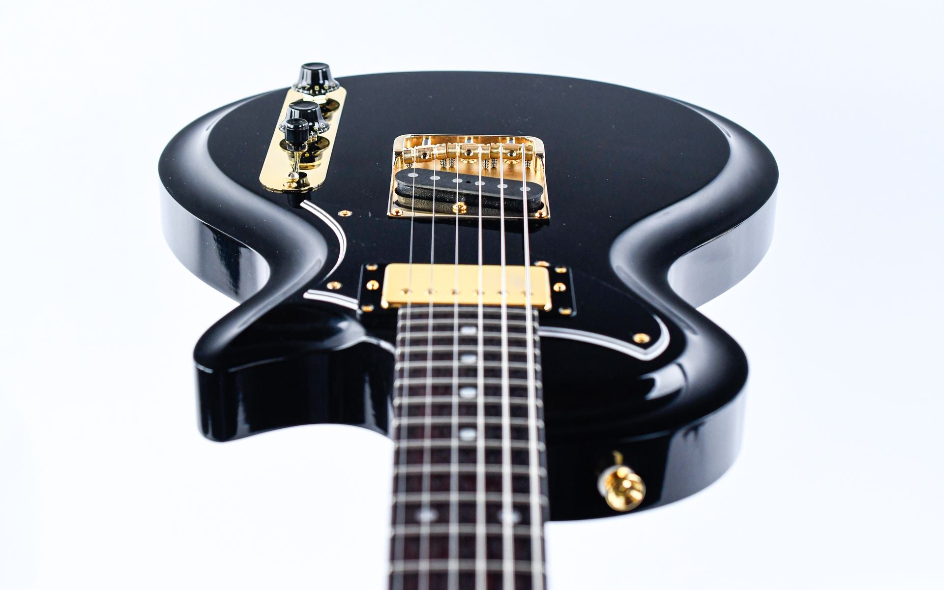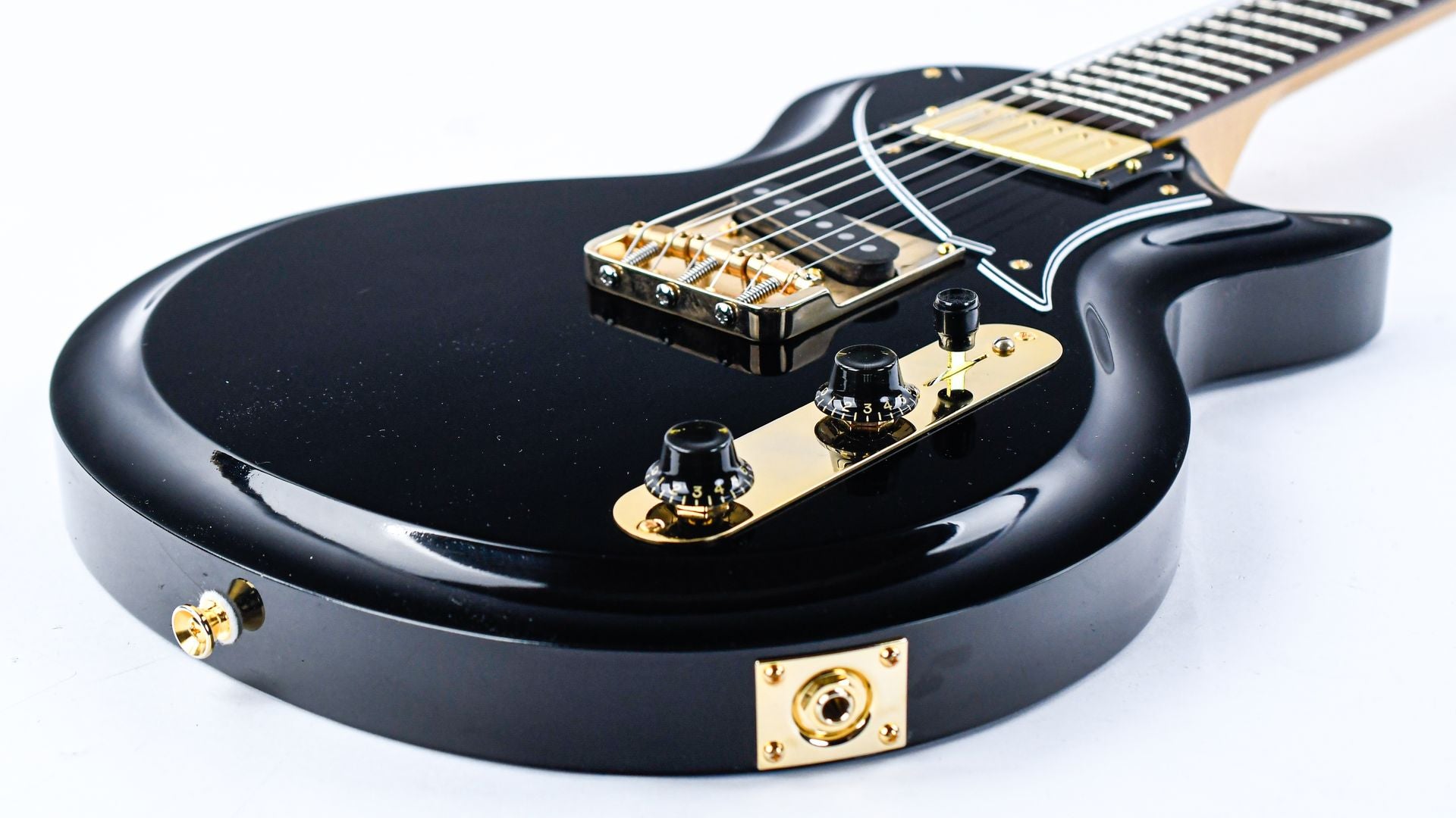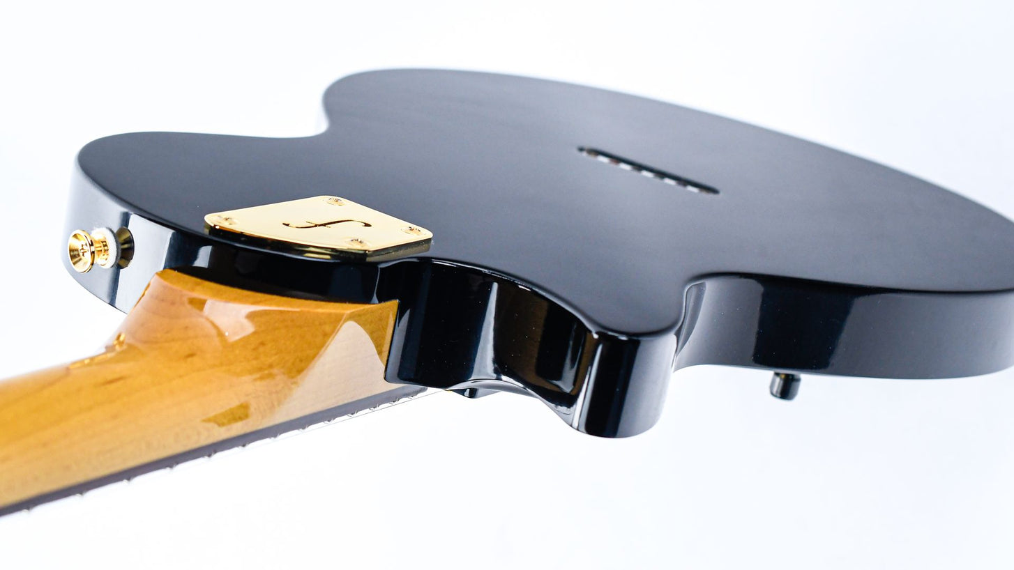 The SP6 is one of eight models in this series, and is a lightweight single cut guitar with graceful curves built with comfort and speed as the main focus. This model has an alder body with a German Carve and Bull Black Finish, and it has been expertly provided with an understated but very convincing relic. The maple neck is silky smooth and comfortable, and is also very ergonomic to play in the higher positions due to its rounded heel. The matching headstock is the proverbial icing on the cake!