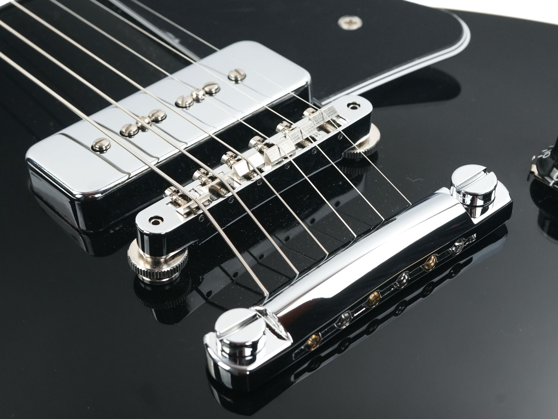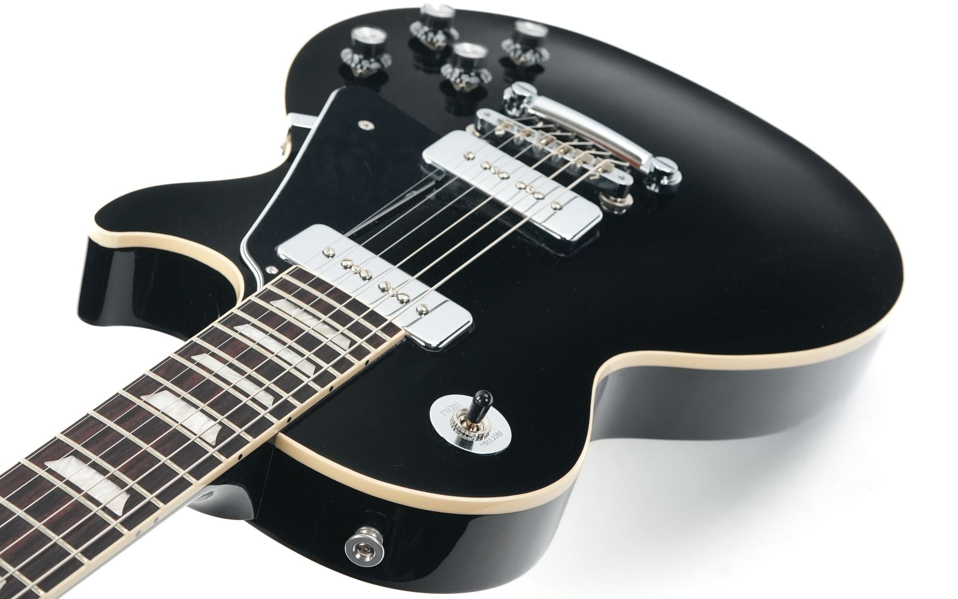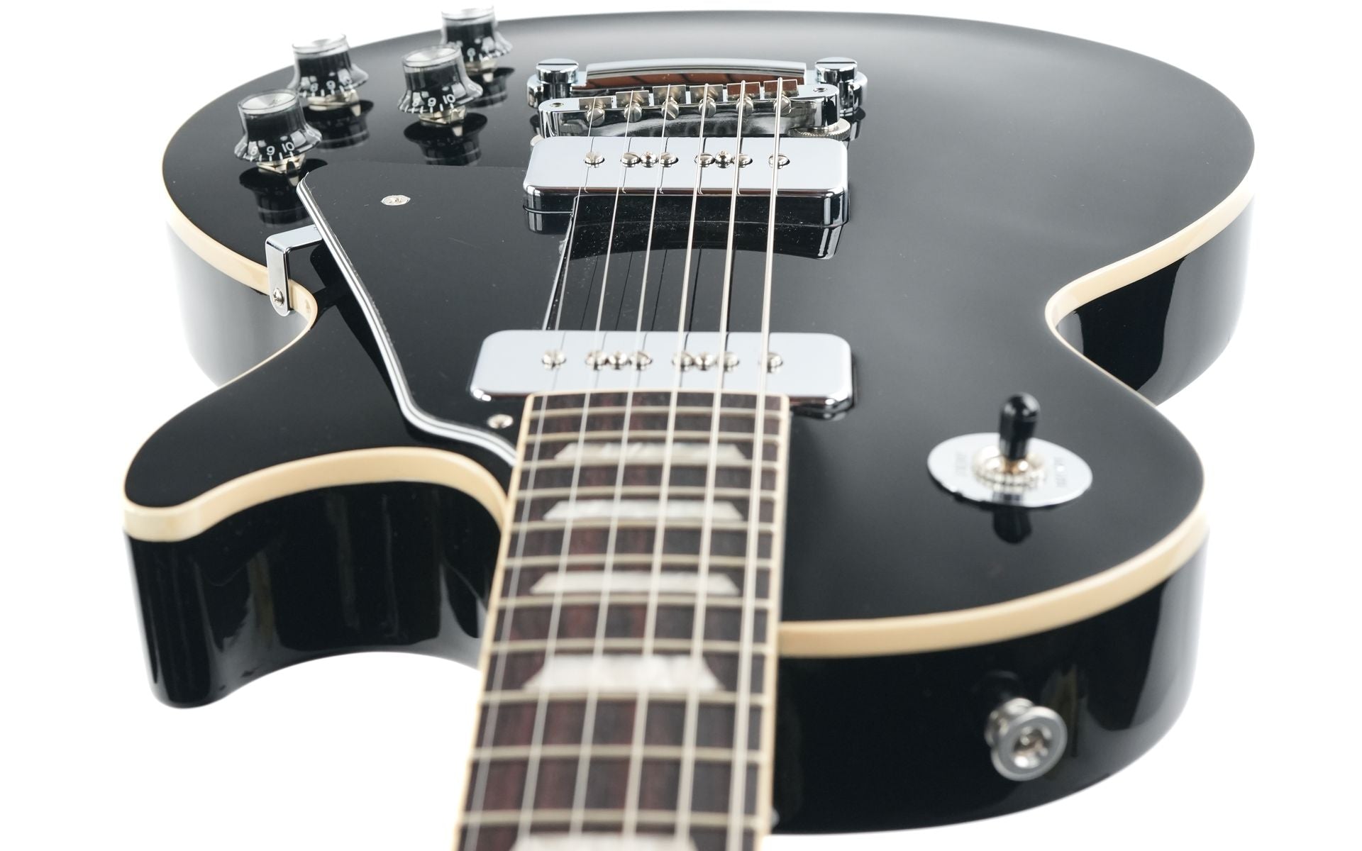 Two chrome-covered Gibson P-90 Soapbar pickups provide a distinctive tone that’s raw, punchy, and unmistakably British. Combined with an ABR-1 Tune-O-Matic bridge, aluminum Stop Bar tailpiece, and Grover Rotomatic tuners, this guitar ensures rock-solid tuning stability and powerful sustain. Finished in elegant Ebony, it’s completed with black Top Hat knobs and a five-ply black pickguard reminiscent of vintage Les Paul Custom models.