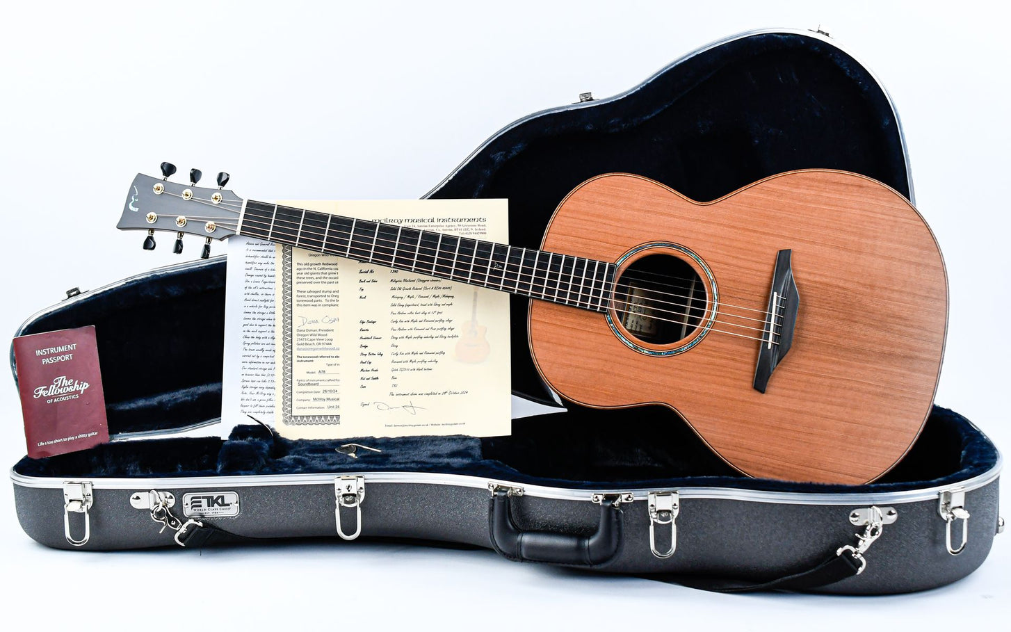 McIlroy has something very special in store for this A78; the guitar is built with a Malaysian Blackwood back and sides that are accompanied by an Old Growth Redwood top that was harvested from trees felled in Northern California over 100 years ago. These trees were the 1500 to over 2000 year old giants that were over 120 meters high. The wood was transported to Oregon where it was processed into the tonewood that ended up in this guitar, among other things.