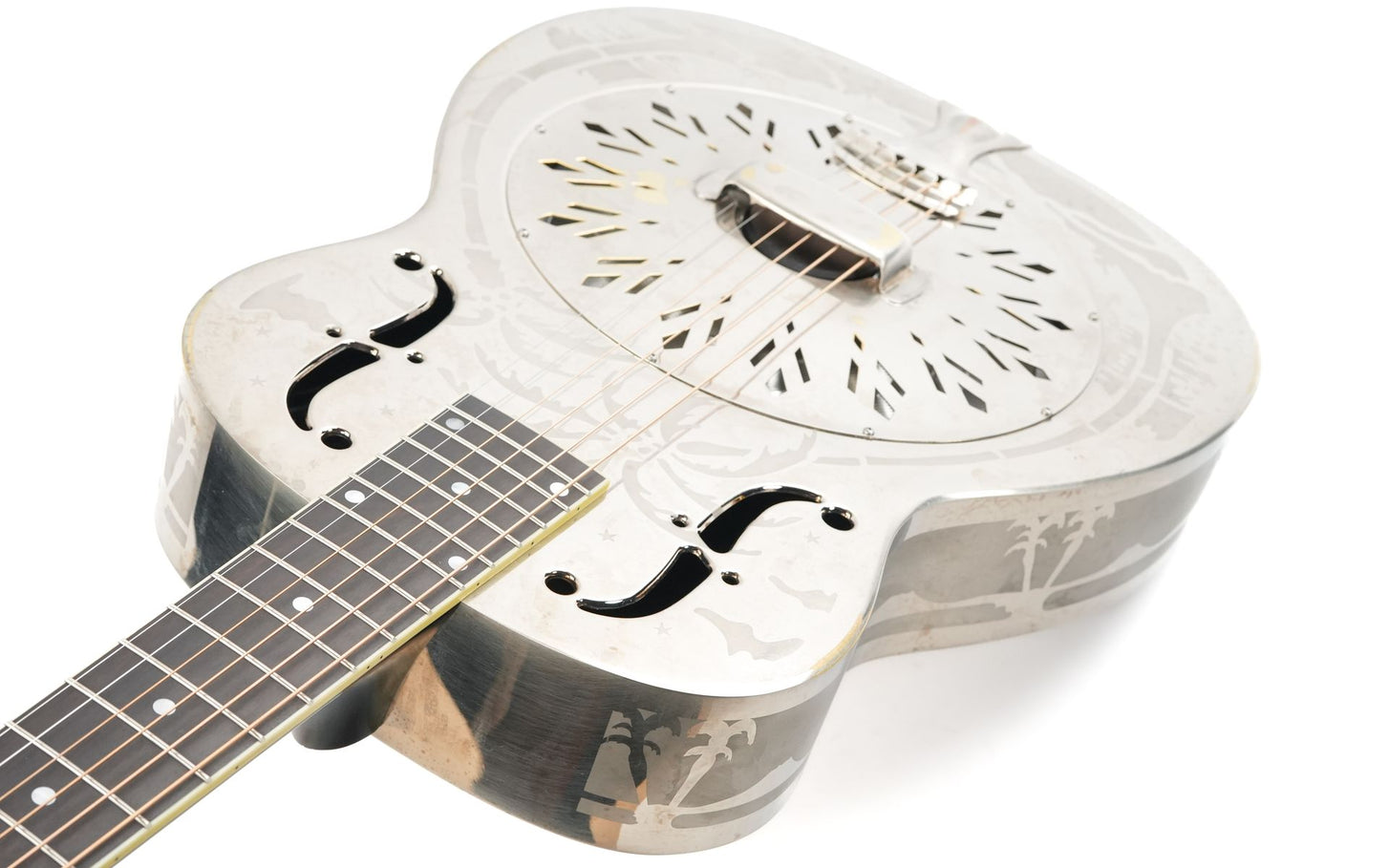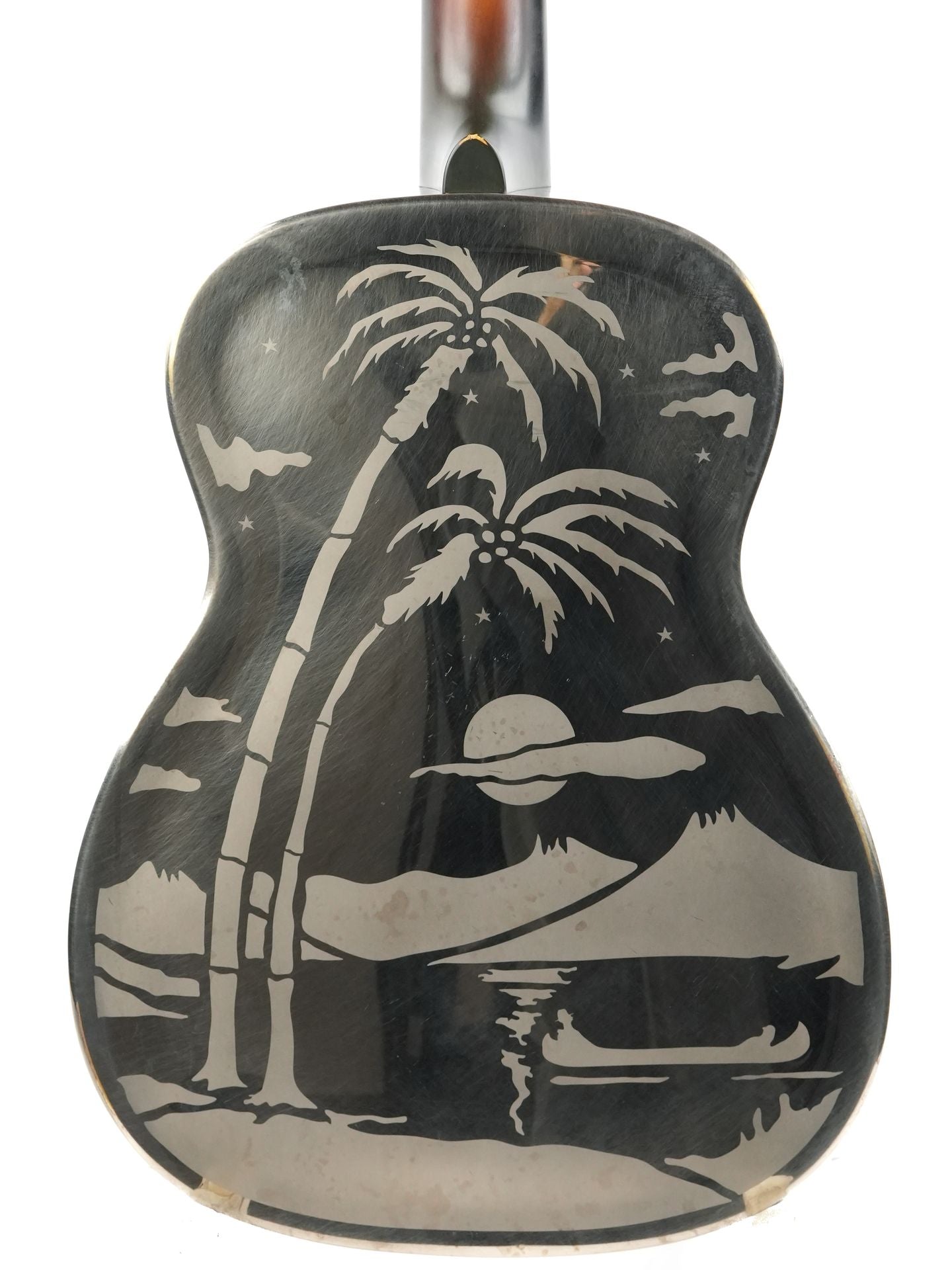 The instrument features a brass body polished to a mirror finish, nickel-plated, and adorned with etched exotic Hawaiian palm tree scenes, followed by a special hand-burnished finish!