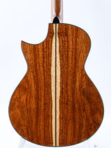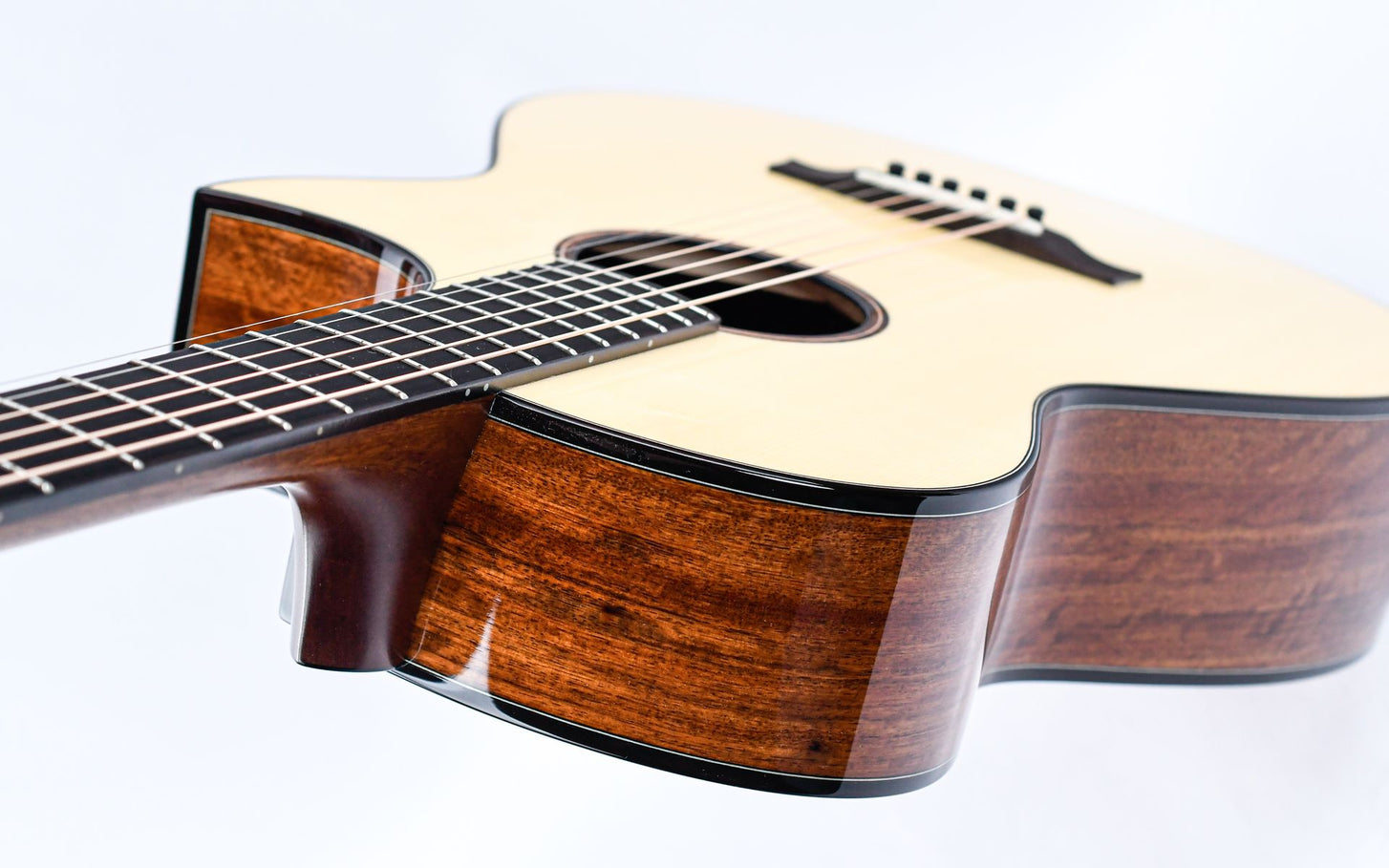 The African Koa used for this guitar is a fascinating wood that, despite its name, is not related to the well-known Hawaiian Koa. This African variety brings its own unique properties; it has a warm, resonant sound with a beautiful natural sheen and a characteristic grain that makes each guitar a unique work of art. The Swiss spruce top complements the Koa perfectly with its open, bright response and excellent projection.