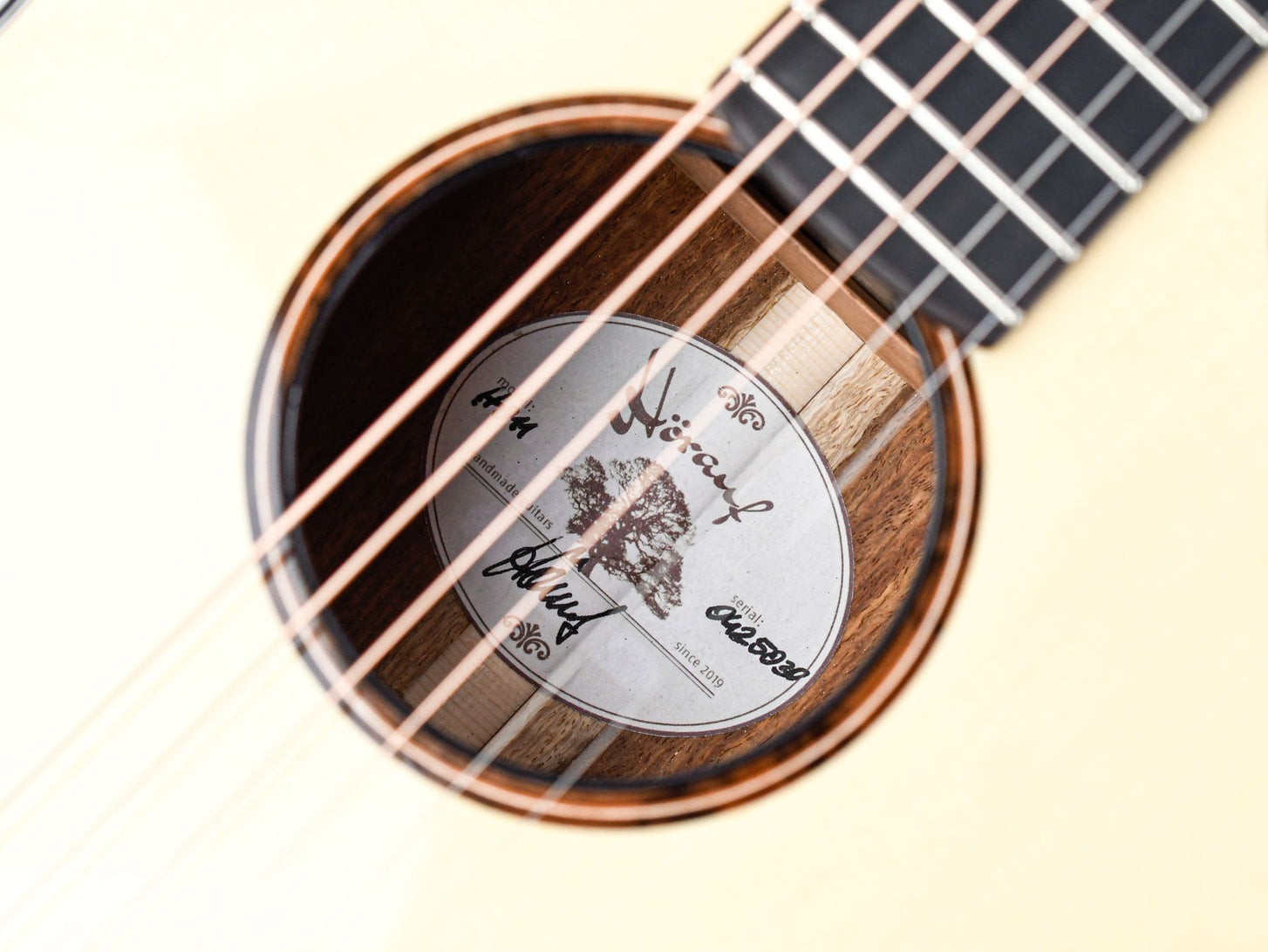 Volker Hörauf is a German guitar maker who builds handmade acoustic guitars with great precision and craftsmanship in Traryd, Sweden. With a background as a carpenter, wood engineer and classical pianist, he combines more than thirty years of experience in each instrument. After an apprenticeship with master luthier Michael Sandén, he works completely independently and produces unique custom guitars, making all the parts himself. His instruments are distinguished by high-quality wood selection, personal tuning and a natural tonal balance, and are loved by guitarists looking for a refined sound and a sustainable playing experience.