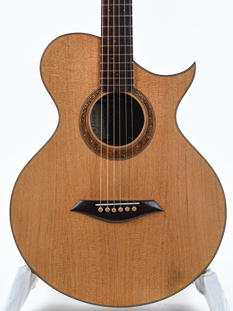 Zum Beispiel baut Lucas die Arbor oft mit der Sweep Cutaway-Option, die einen einfachen Zugang zu den höchsten Bünden ermöglicht. Der "Manzer-Keil" ist ebenfalls ein Markenzeichen der Lucas-Gitarren. Er wurde von Linda Manzer, einer renommierten Gitarrenbauerin, entwickelt. Die Tiefe des Korpus verjüngt sich über die gesamte Breite, so dass er auf der Bassseite unter dem Unterarm des Spielers schlank ist und auf der Diskantseite, wo er auf dem Oberschenkel des Spielers aufliegt, tiefer ist. Dies sorgt für eine bequeme Passform, während das normale Luftvolumen im Korpus erhalten bleibt.