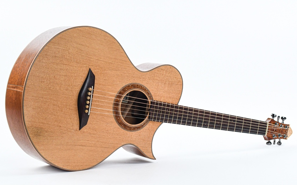 Het Honduras mahoniehout van de body is afkomstig uit een muziekkroeg, terwijl het bovenblad en de interne bracing is gemaakt van teruggewonnen Douglas spar van oude deuren! Ook in de constructie zijn een aantal kenmerkende eigenschappen te vinden.