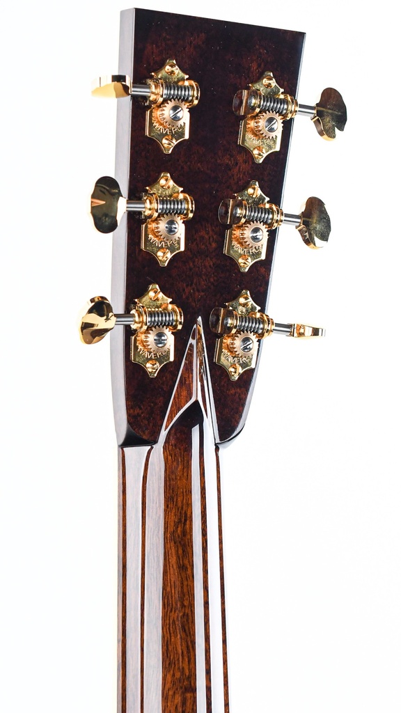 Diese OM3 besteht aus einer Sitka-Fichtendecke, die mit Boden und Zargen aus indischem Palisander gepaart ist. Der Hals aus Honduras-Mahagoni verfügt über ein Ebenholz-Griffbrett, das ebenfalls mit Ivoroid eingefasst ist und sich zur Kopfplatte hin fortsetzt, die mit einem besonders schönen Ebenholz-Kopfplatten-Overlay, einem eingelegten Collings-Logo aus Perlmutt und goldenen Waverly-Mechaniken mit offener Verzahnung verziert ist.