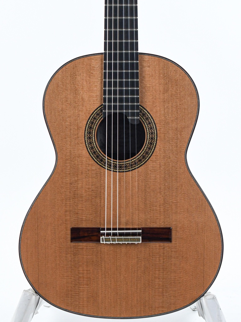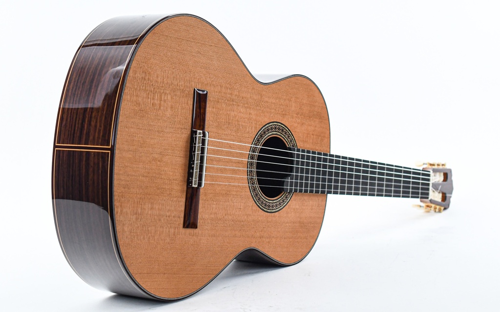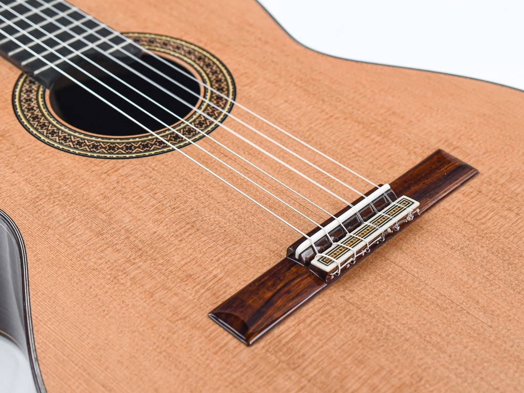 The carefully selected tonewoods have been crafted into a true masterpiece by Mengual's skilled hands. The rosewood back and sides feature a cedar top, while the cedar neck is in turn accompanied by an ebony fingerboard.