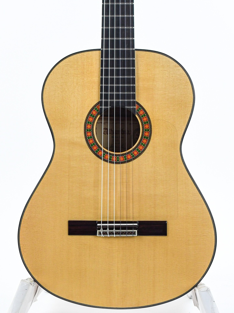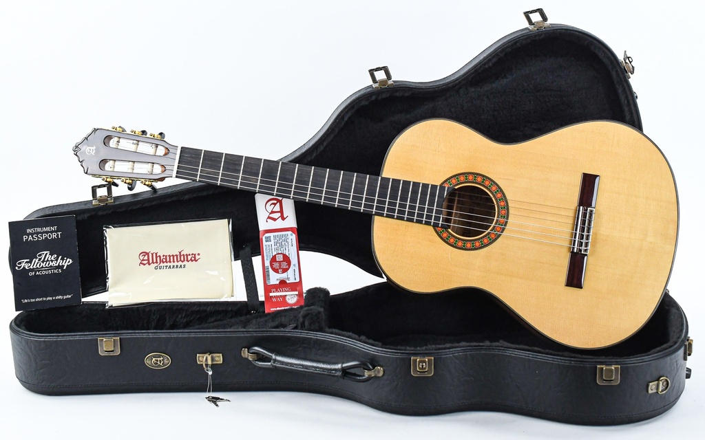 The Alhambra F10Fc is a beautiful flamenco guitar with a solid book matched Cypress body with a German spruce top. Throw in an ebony fingerboard on a Spanish cedar neck with an ebony reinforcement and you have the recipe for pure Flamenco.