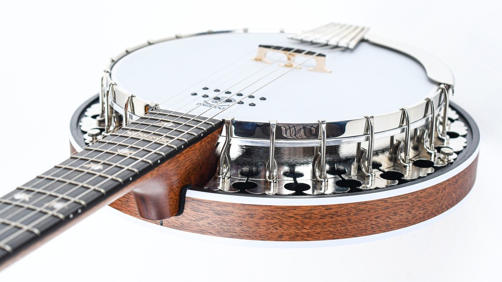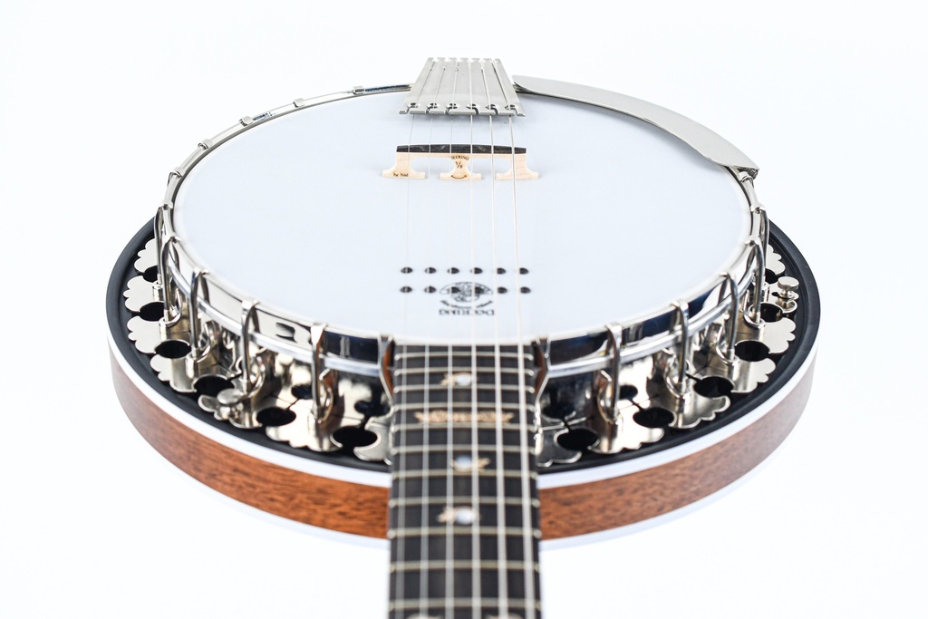Uniquely Deering, the Boston banjo breaks with tradition and provides a professional quality sound at a lower price point by creating the rim from 3/16″ rolled steel which rings like a tone ring. Also, upgrading the accuracy of tuning by way of guitar tuners with a higher gear ratio than the traditional banjo tuners.
