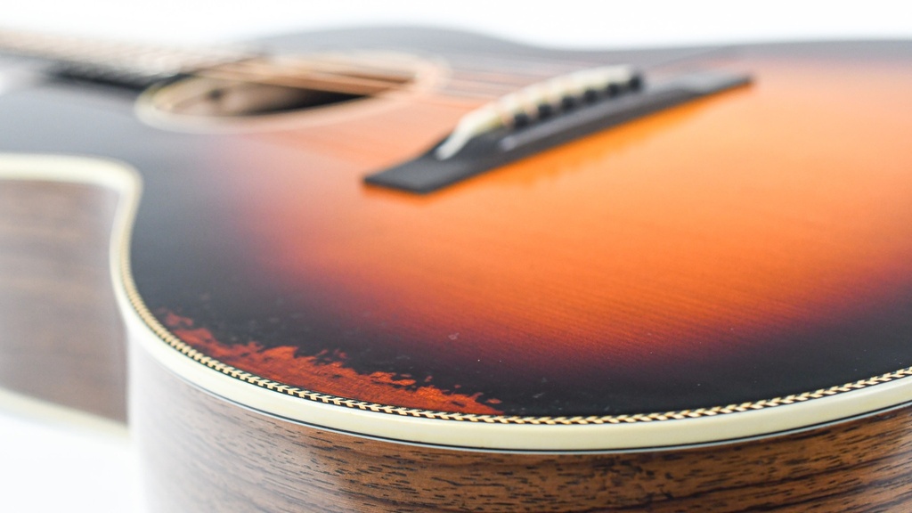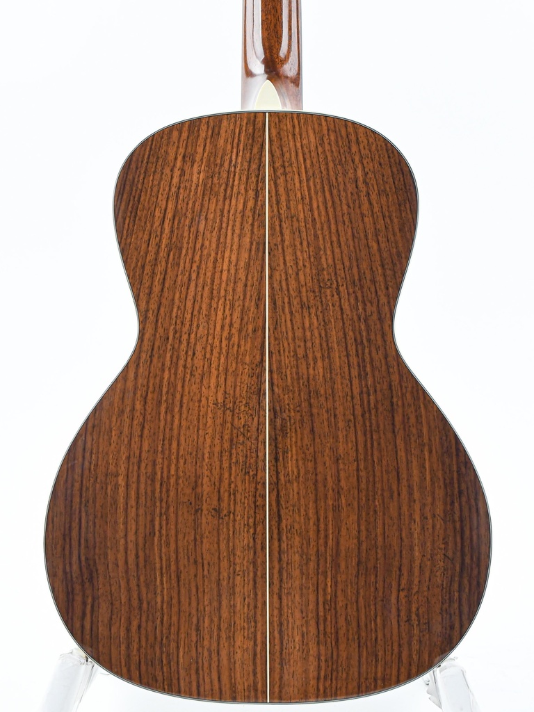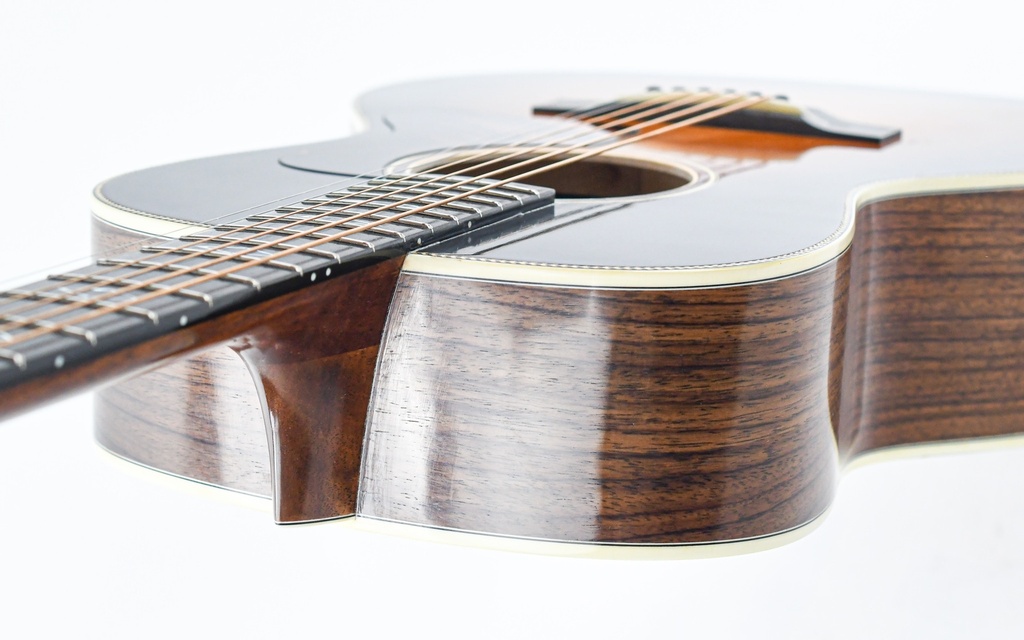 De massief palissander klankkast en het Adirondack sparren bovenblad, ondersteund door scalloped X-bracing, zorgen voor een rijke, complexe klank met sprankelende hoge tonen en diepe bassen. De klassieke details zoals herringbone purfling, ivoroid binding en een firestripe slagplaat geven deze gitaar een tijdloze elegantie die doet denken aan vooroorlogse instrumenten.